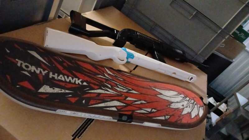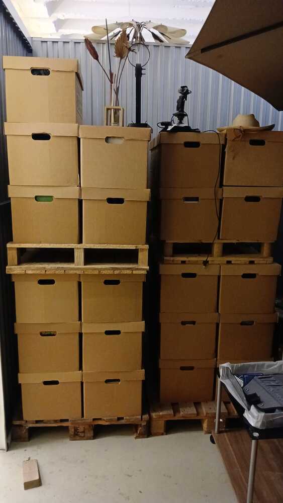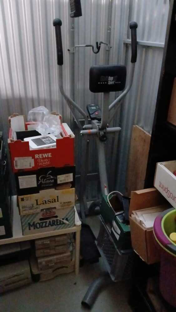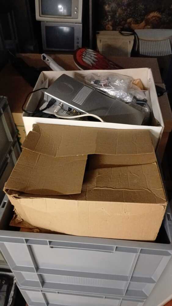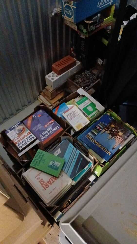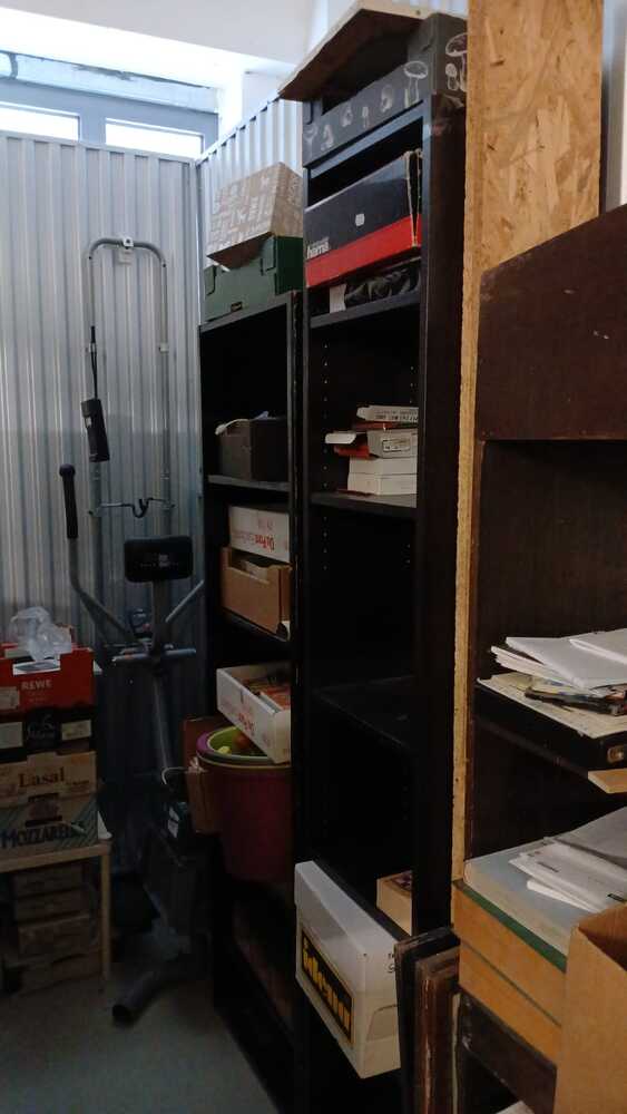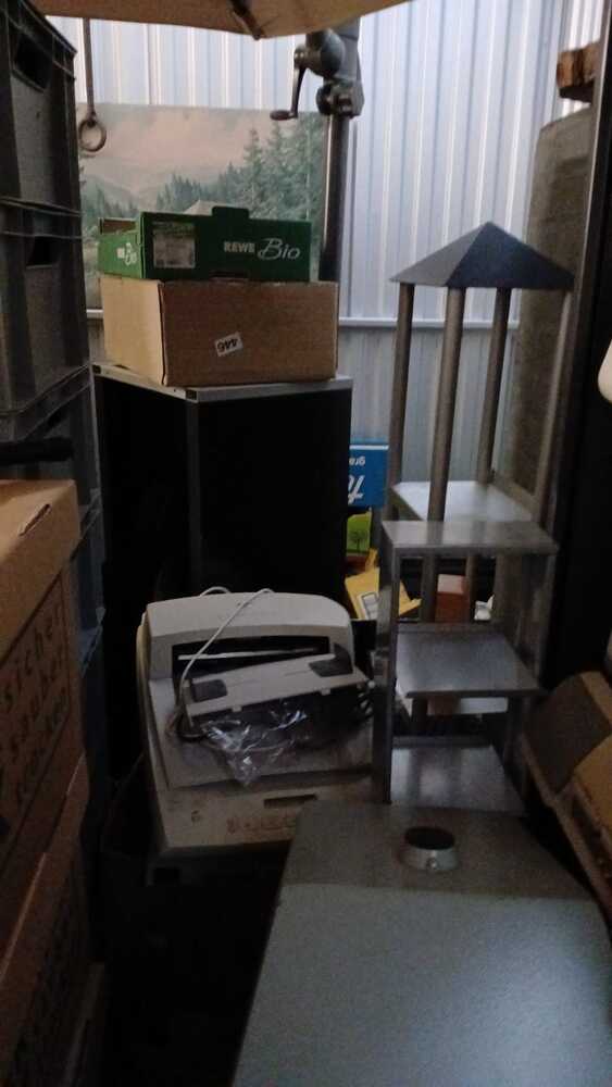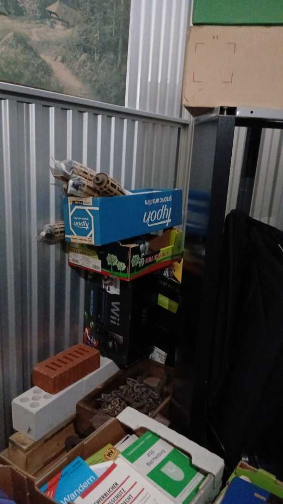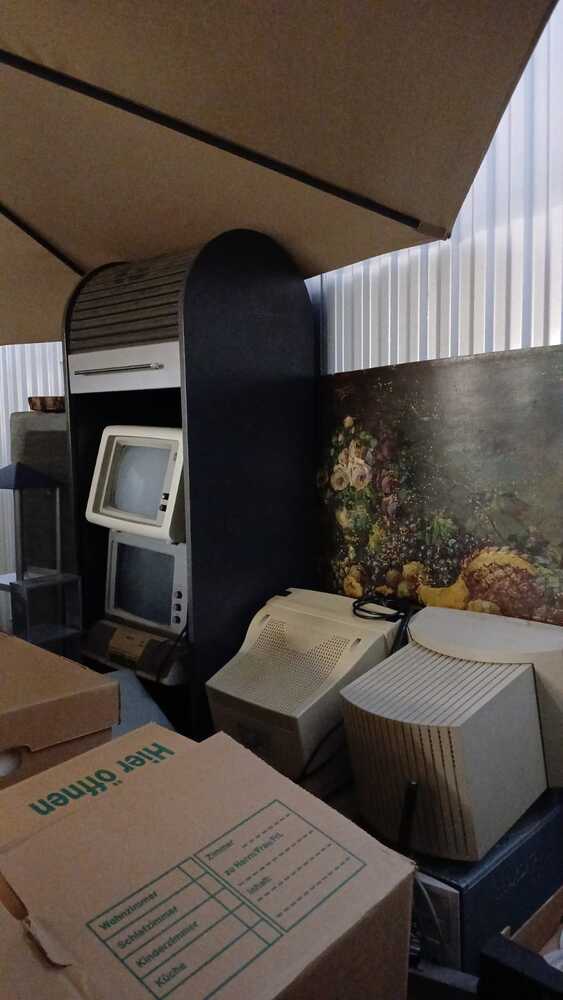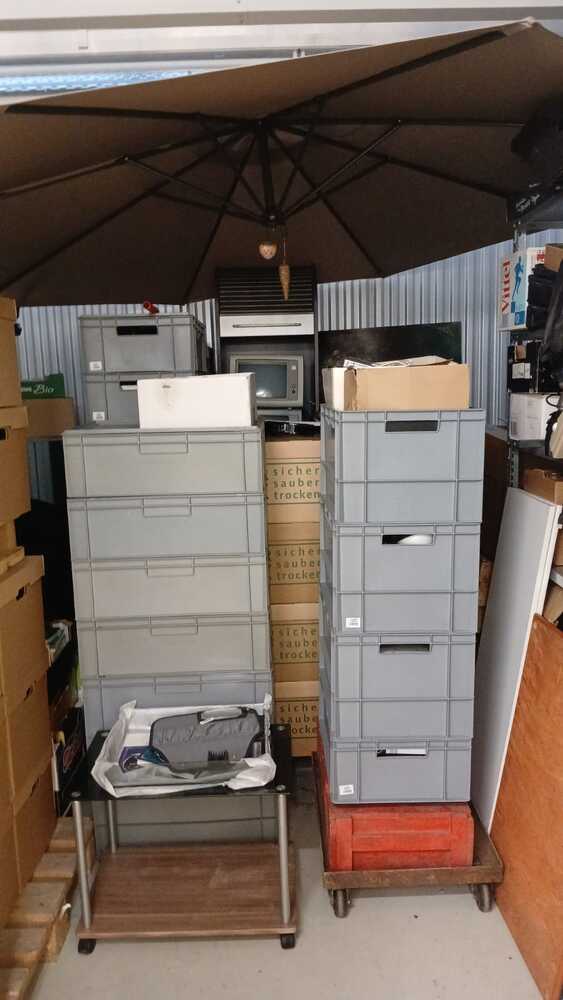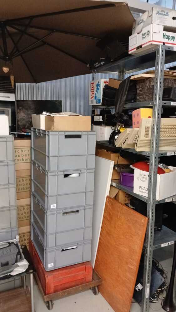 - 5 Paletten mit Kisten (Inhalt unbekannt) - Rolltisch - Monitore (gezählt 5) - PC/Computer-Tower (gezählt 5) - Technikkartons (Bsp. Wii) und diverse kleine Kisten (Inhalt unbekannt) - Technische Kleinteile (Tastaturen, Kabel, Headset, etc.) - Zubehör für Spielekonsolen (Bsp. Tony Hawk-Skateboard, Lenkrad, Gewehre, Joystick) - Altes Siemens-Telefon - Diverse Plastikkisten (Inhalt unbekannt) - CDs + Videokassetten - CD-Regal - Bücher - Fackeln - Sonnenschirm mit Ständer - Rollladenschrank - Regale aus Holz/Metall - Holzschrank - Glasscheibe - Holzteile - Dekoratives (Kleinteile, Bilder, Hut) - Heimtrainer