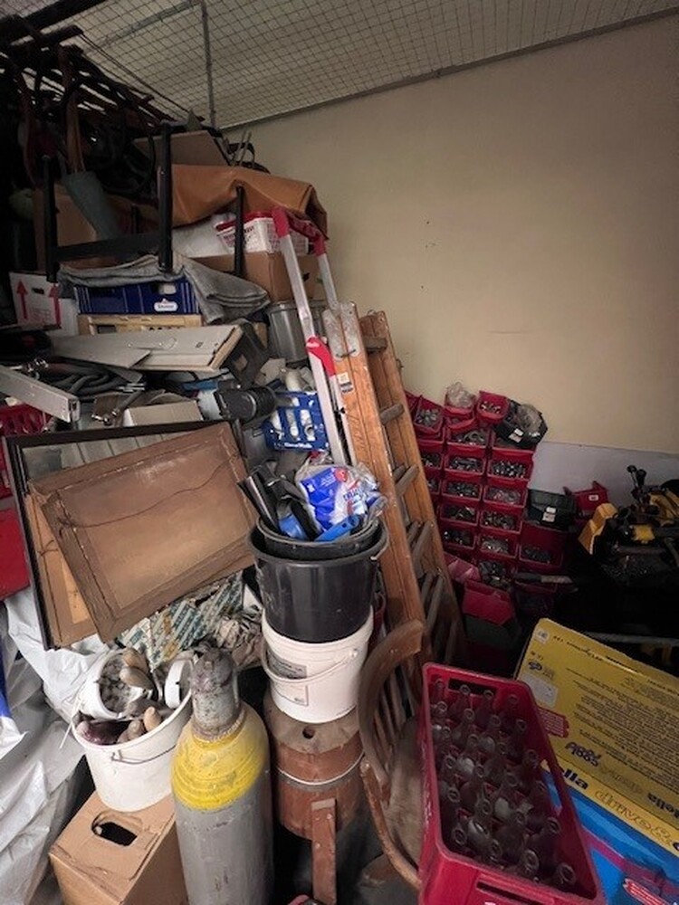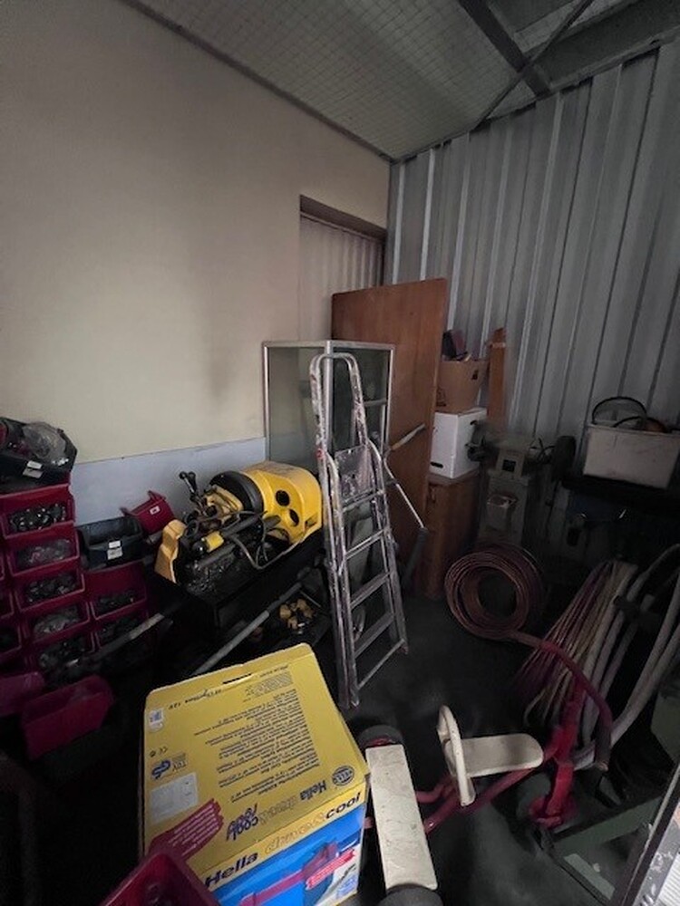 Blandet inventar, håndvaske, en del værktøj og ting til håndværkere, stiger, flyttekasser, maskiner, skruer, stumper.