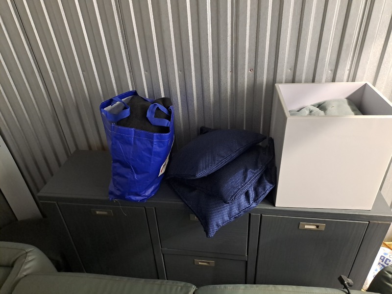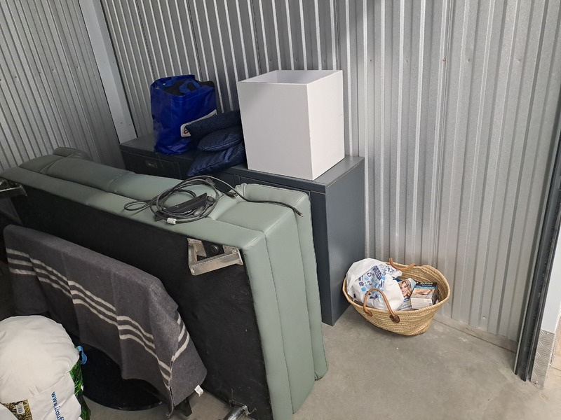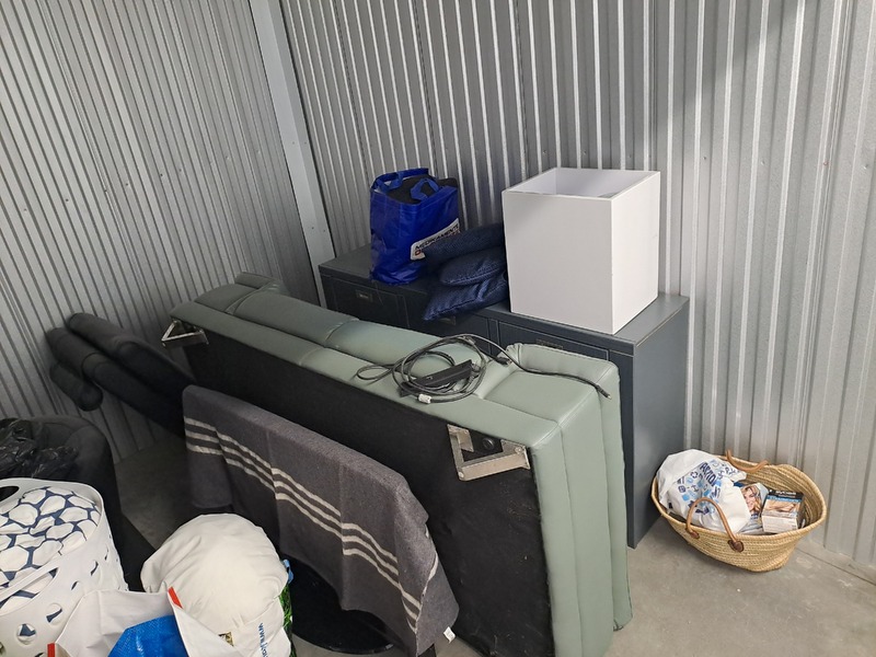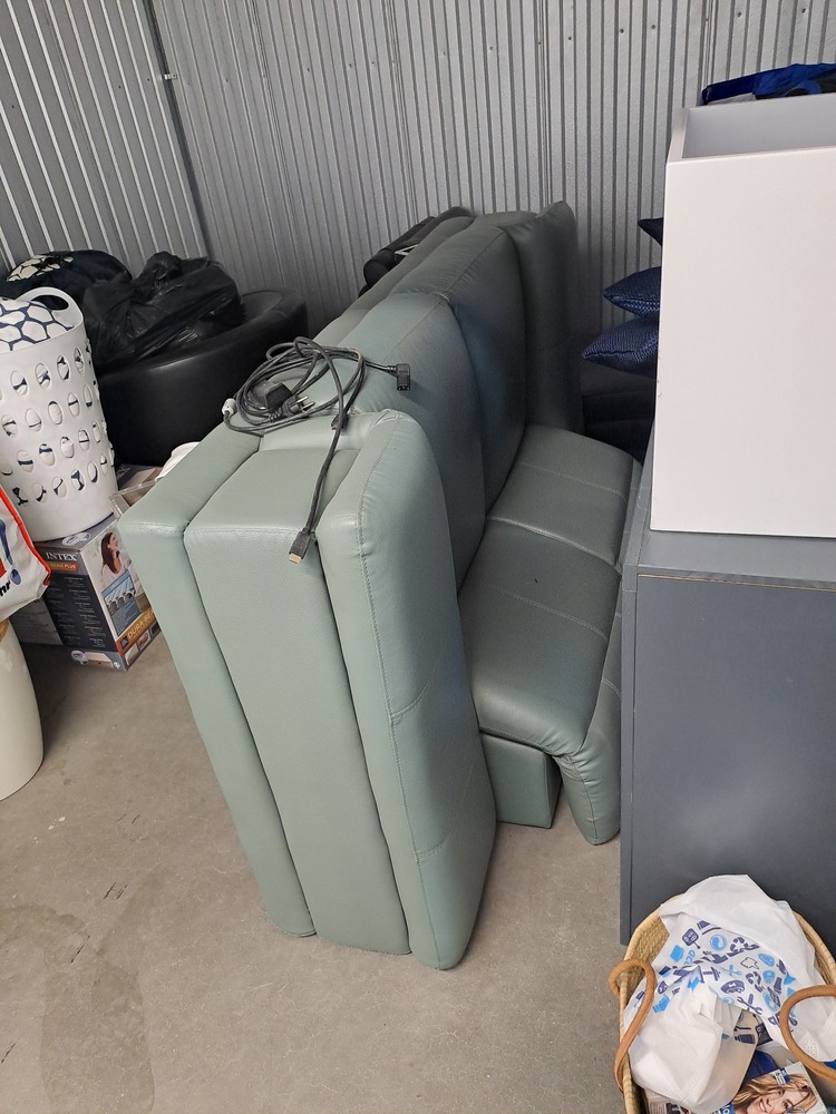Mooie opgebruimde box met nette spullen zoals een mooi dressoir, leren twee-zits bak, zwart leren relex fauteul electrisch verstelbaar, zwart leren fauteul, TV, issolatie box. A beautifully tidied up box filled with neat items, including a beautiful dresser, a leather two-seater sofa, a black leather relex armchair (electrically adjustable), a black leather armchair, a TV, and an insulation box.