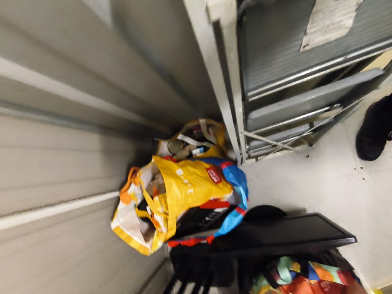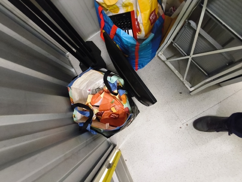 Tüten mit diversem Inhalt. Monitor, kleine Trittleiter