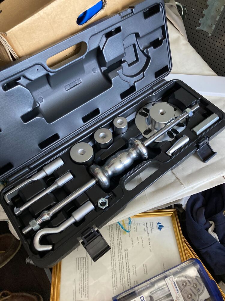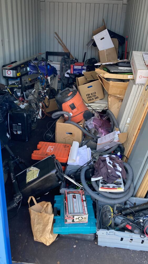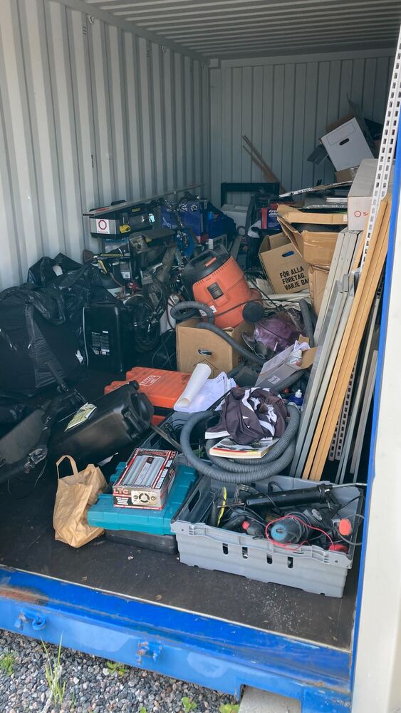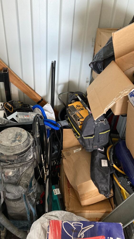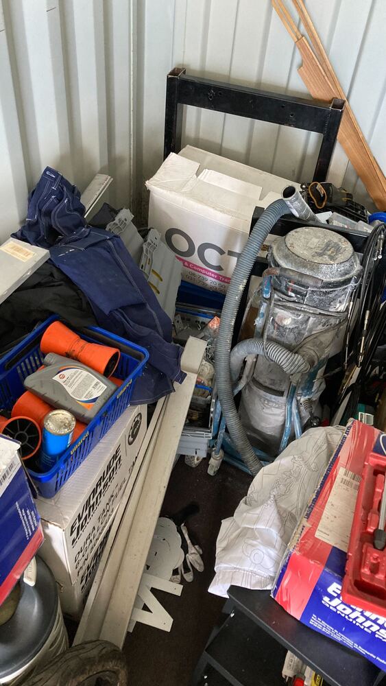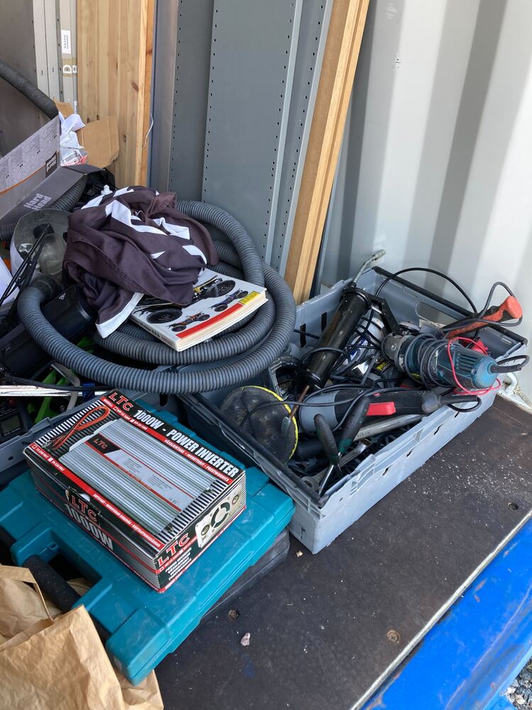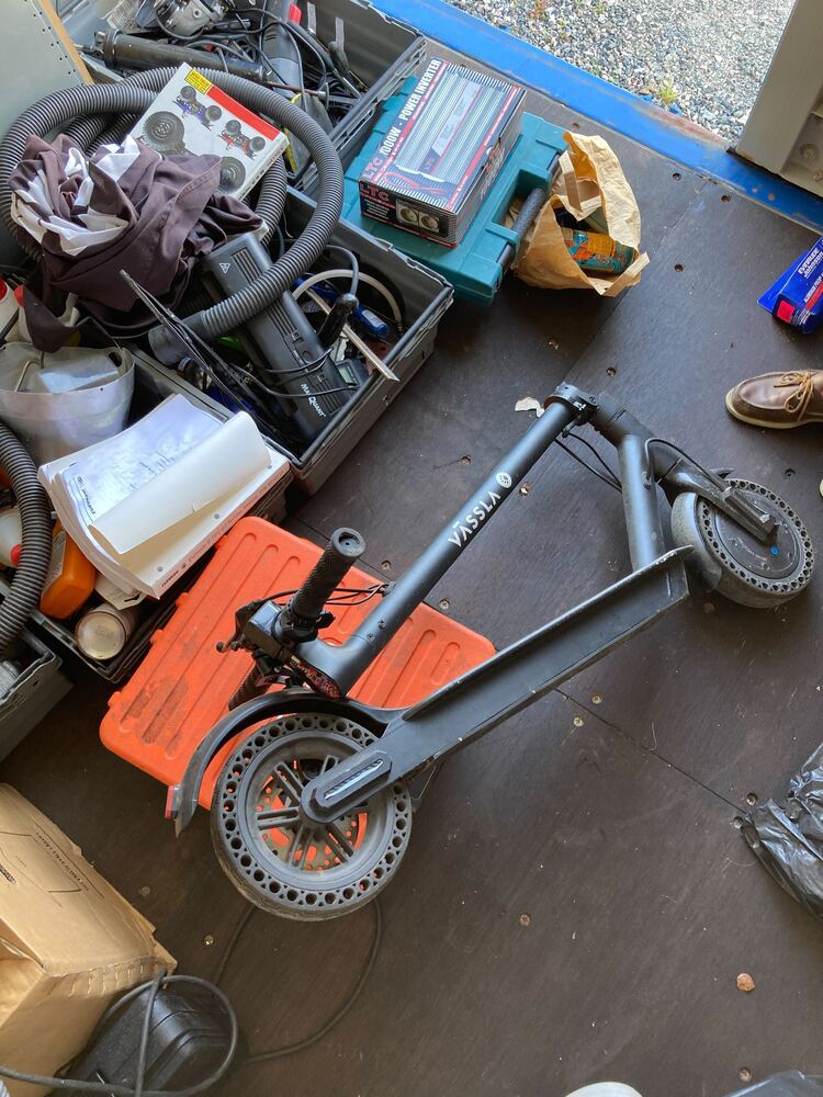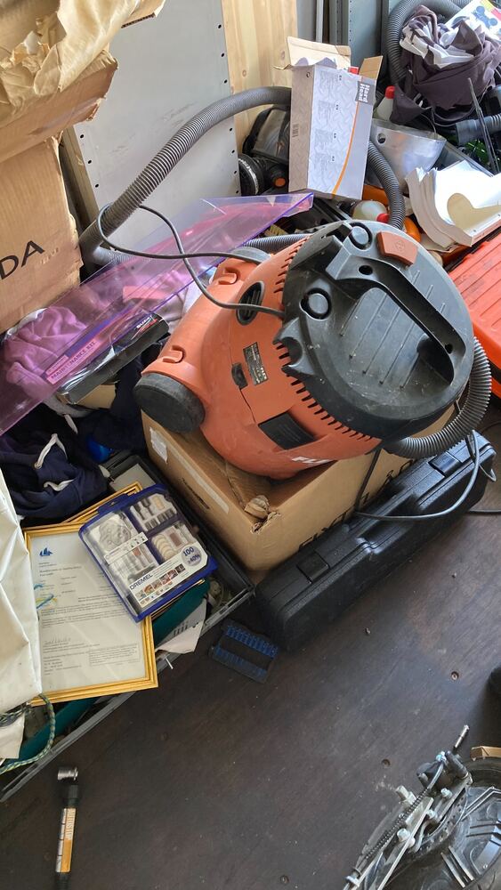 Industridammsugare, slip, Stanley verktygslåda, gasol tub, moped, elsparkcykel och båt propeler.
