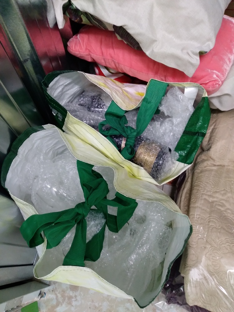 Bags, boxes, household linens, glasses, wine bottles.