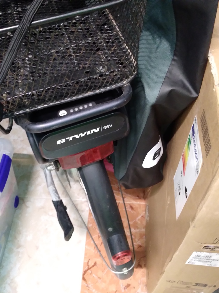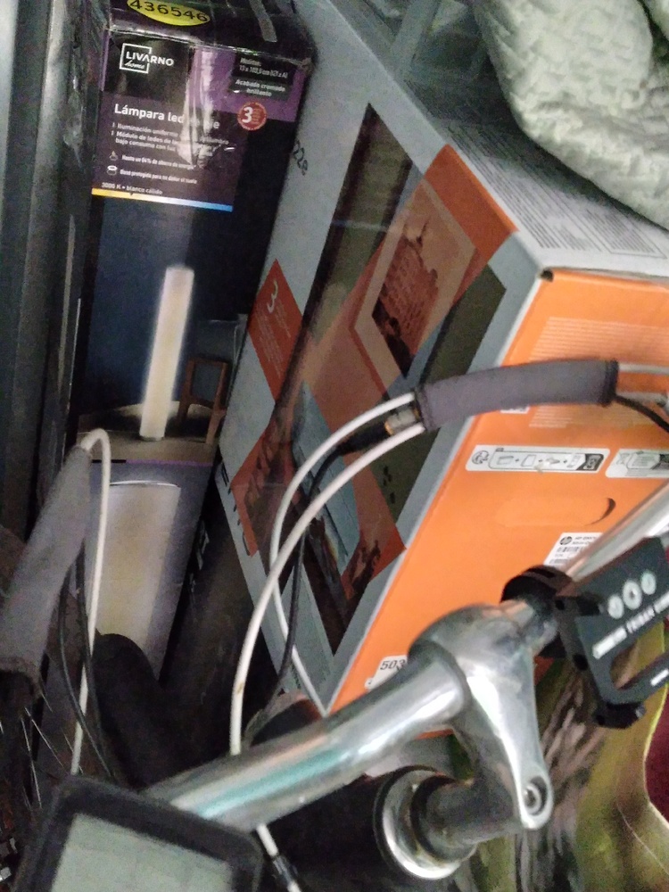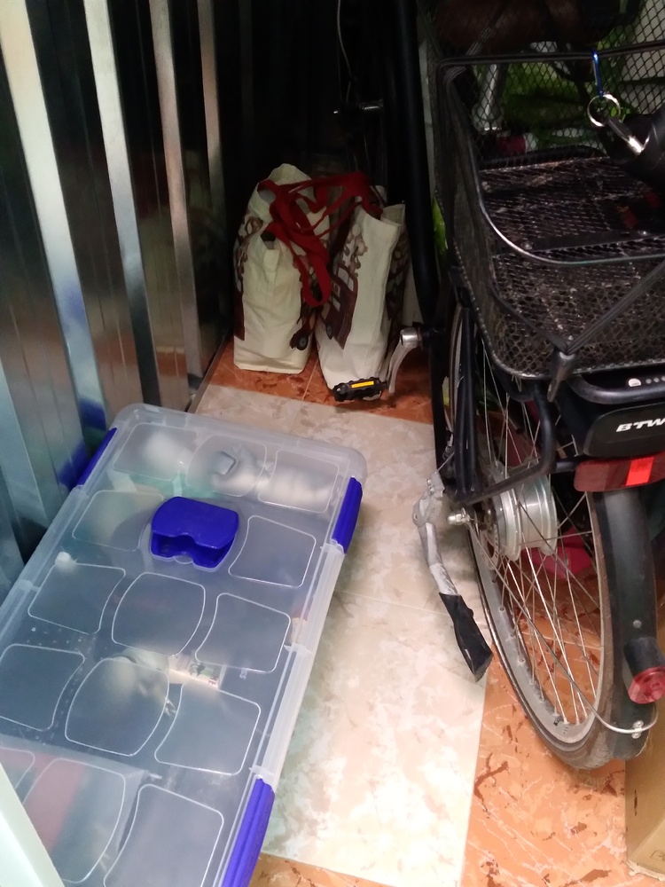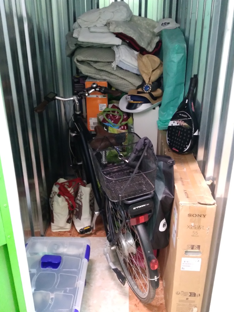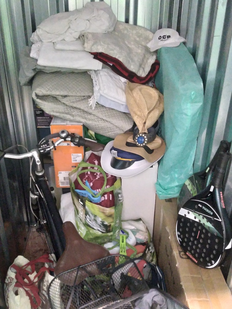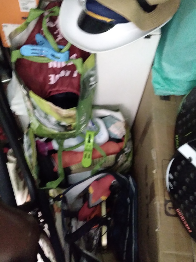 Bicycle, paddle tennis rackets, TV, bags, boxes, clothing, household linens, floor lamp.