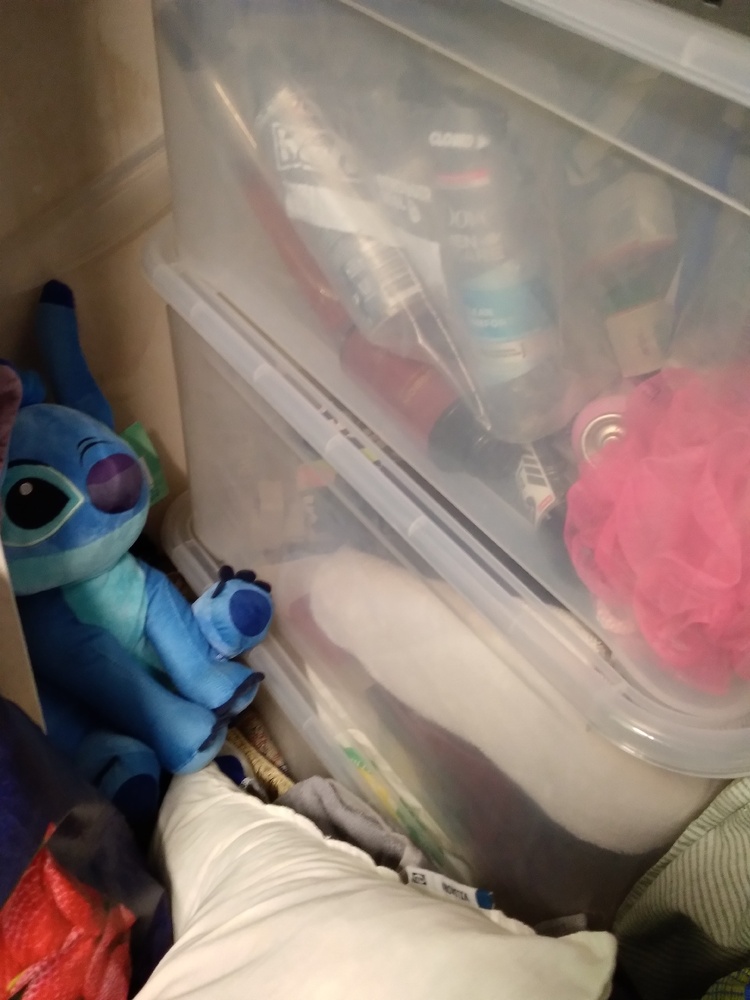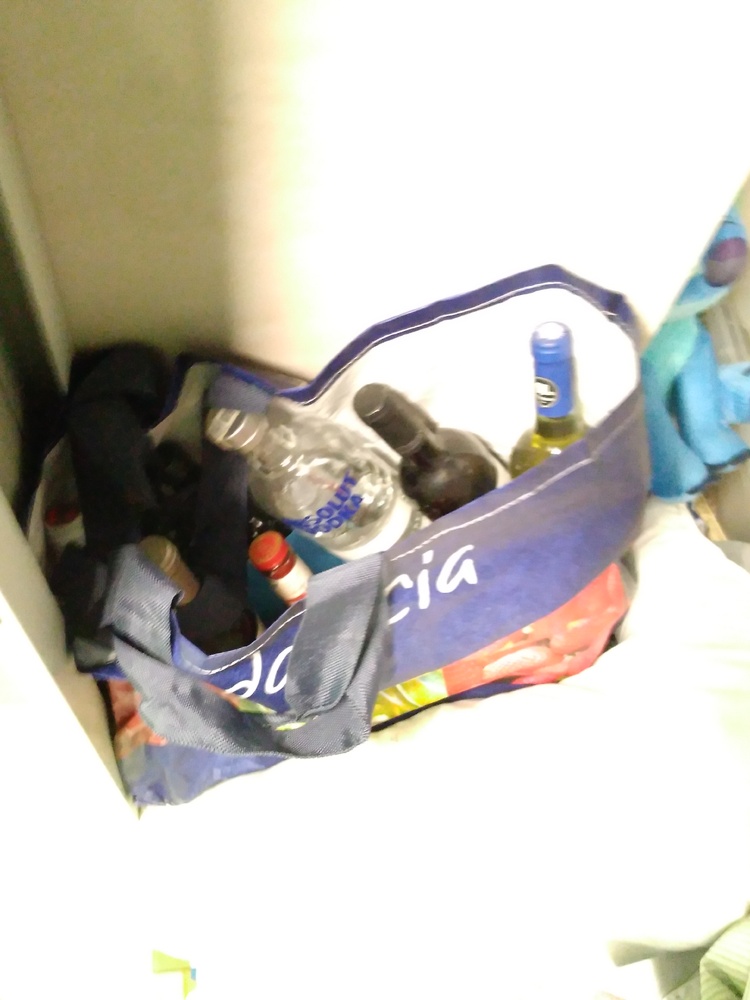 Bags, boxes, alcohol bottles, glasses, household linens, Stich stuffed toy