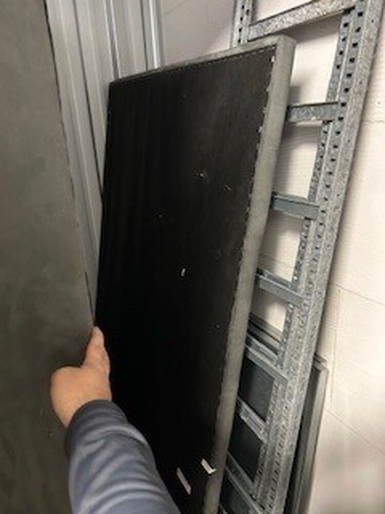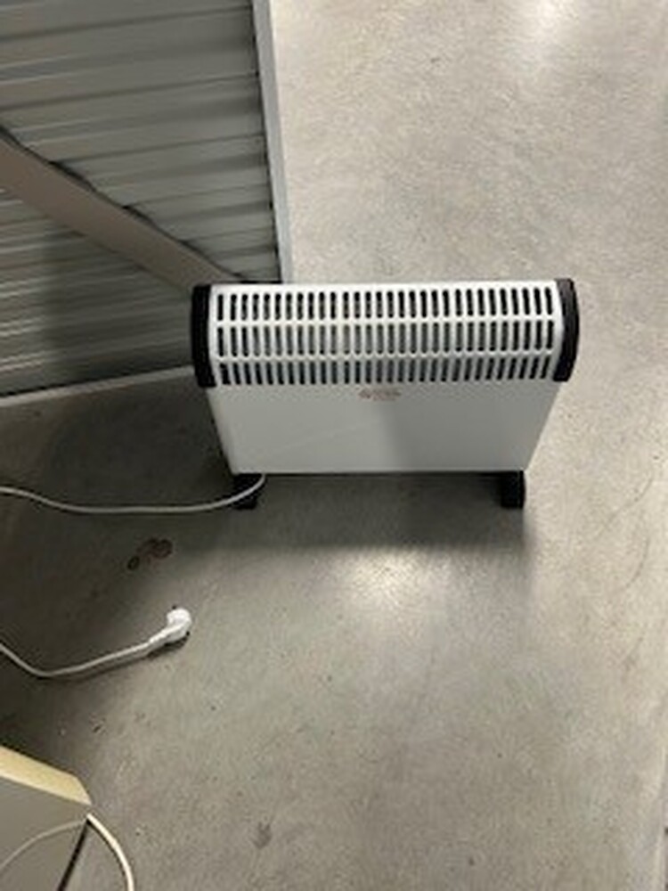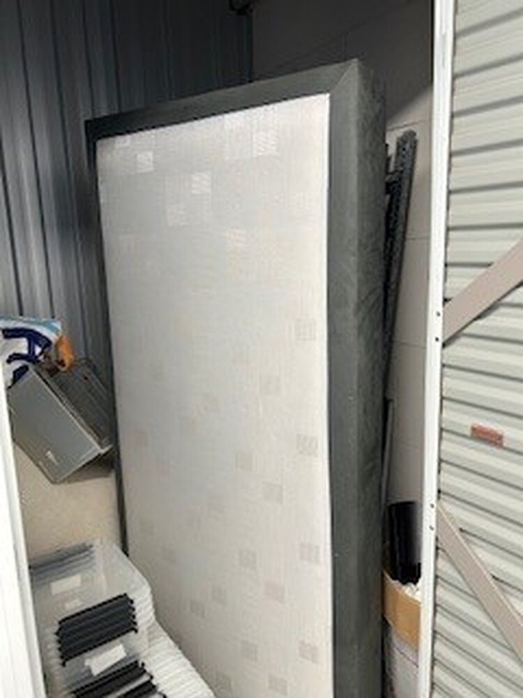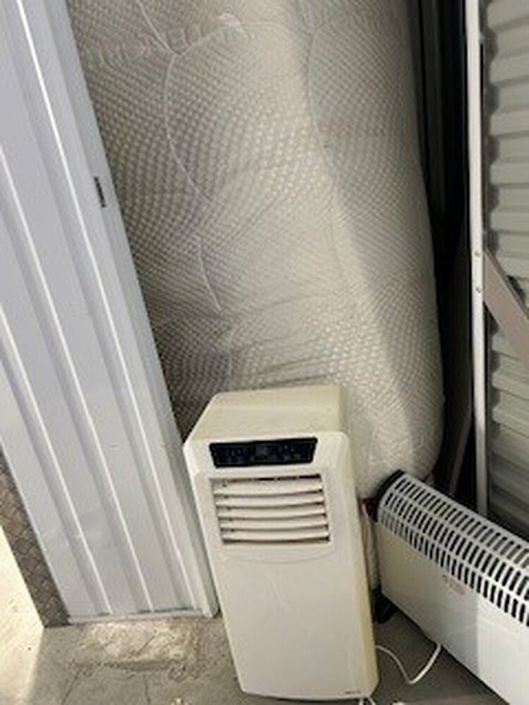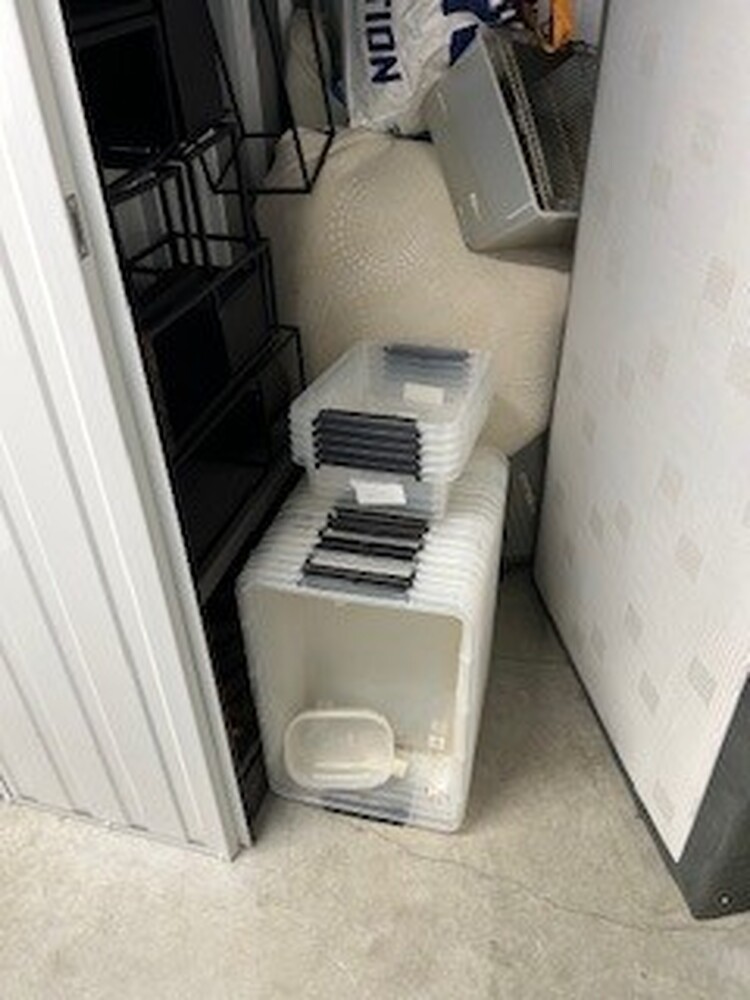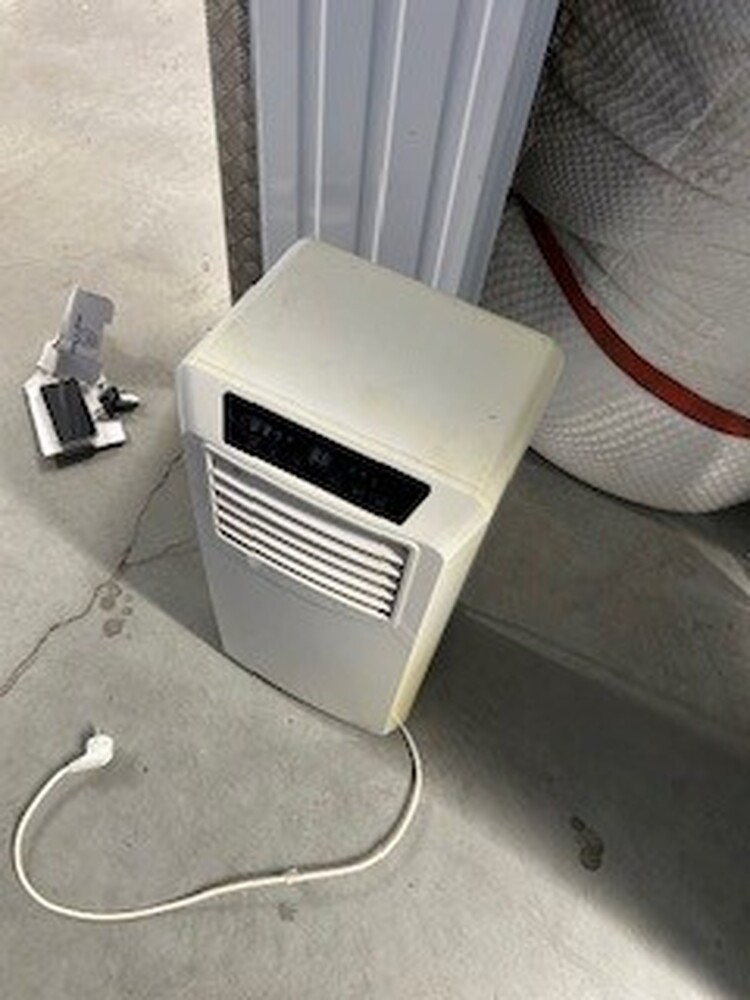 In units liggen. Plastic bakken. Een rek, een airco, elektrische verwarming. Groot matras, elektrische kabels, etc