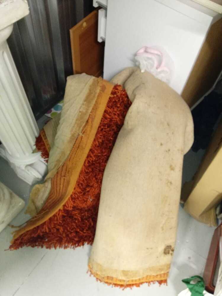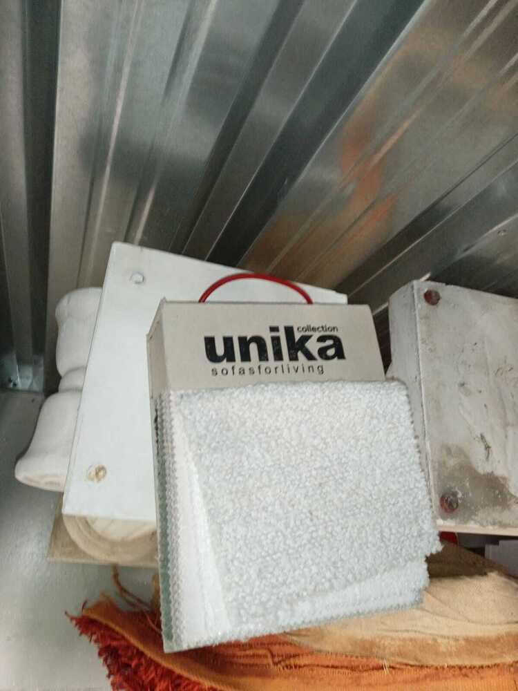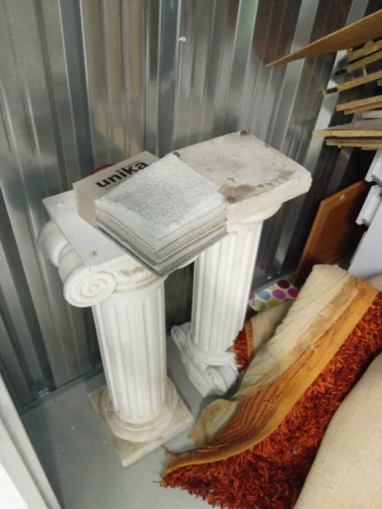 Carpet, shelving, fabric samples, baby stroller, columns, furniture, boxes, bags.