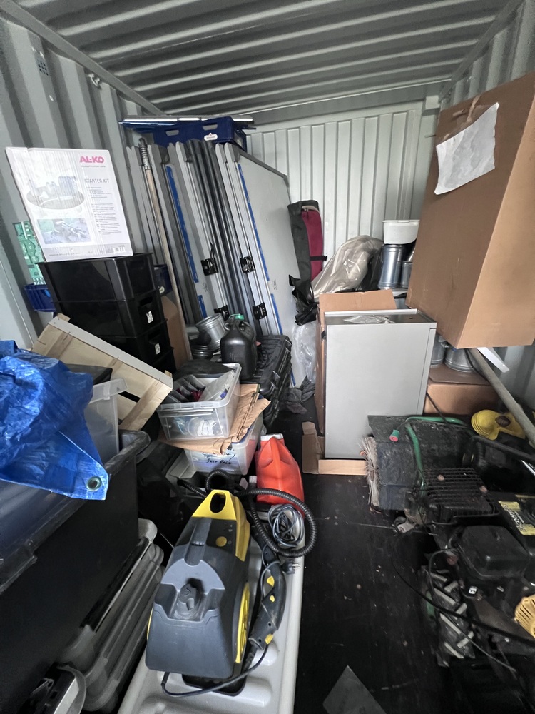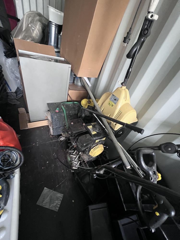Plastkasser, snowboard, plader, højtryksrenser, havemaskiner, fejemaskine, rengøringsudstyr.