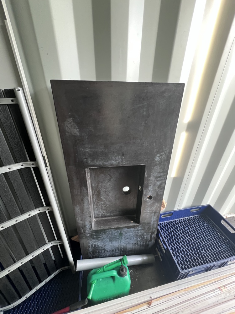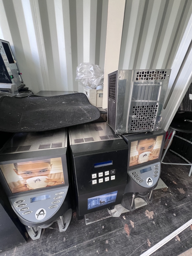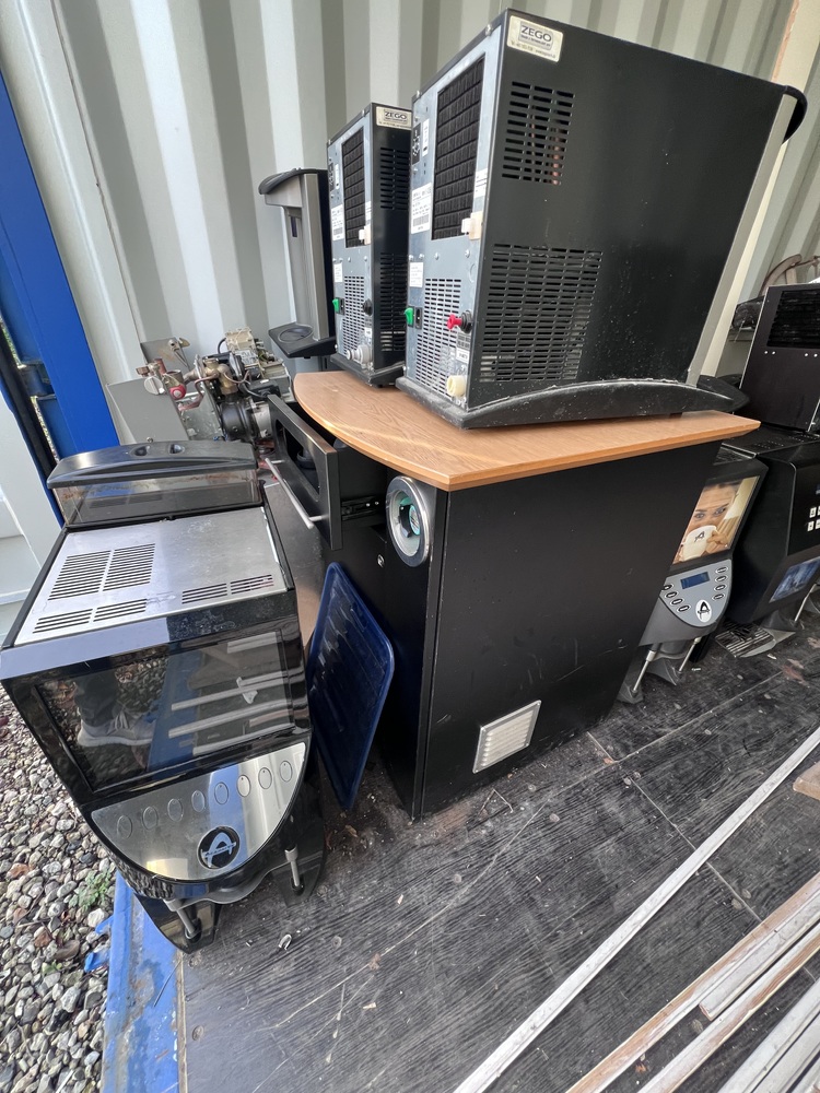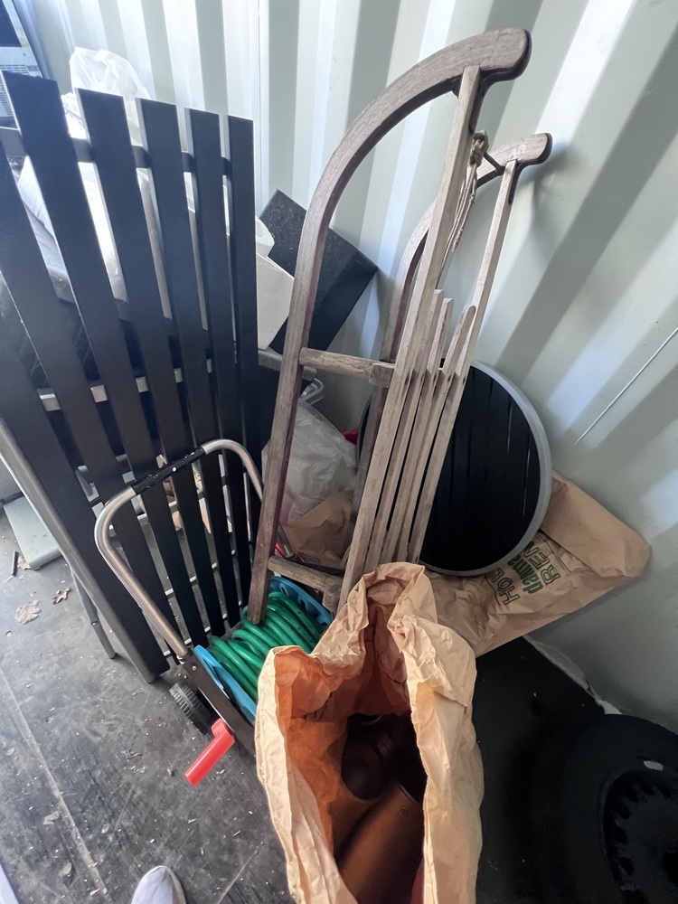 Kaffemaskiner, udendørs lamper, bordplade med indbygget vask, ski, kælk, haveslange med stativ.