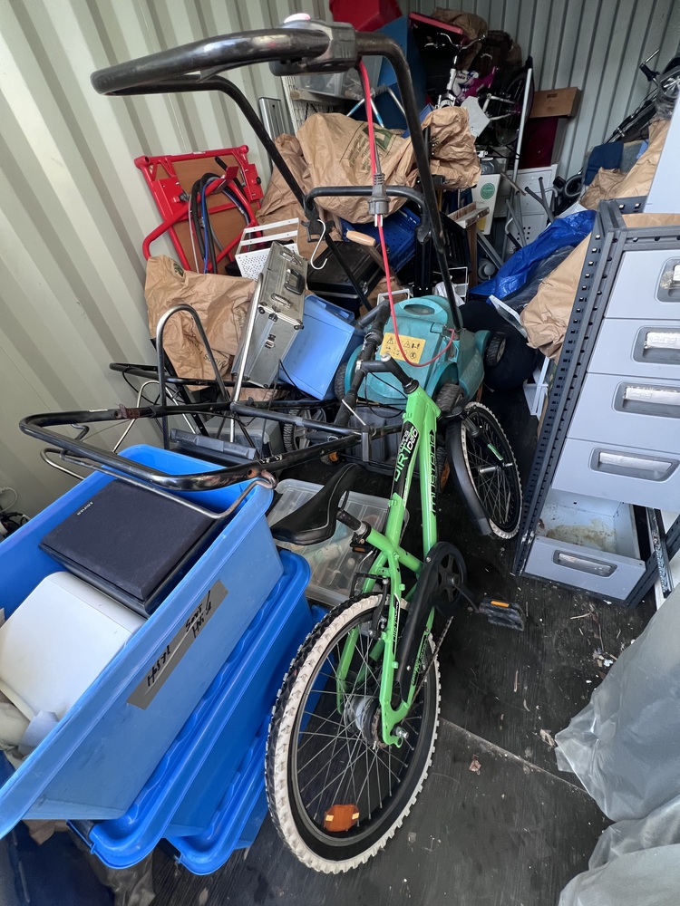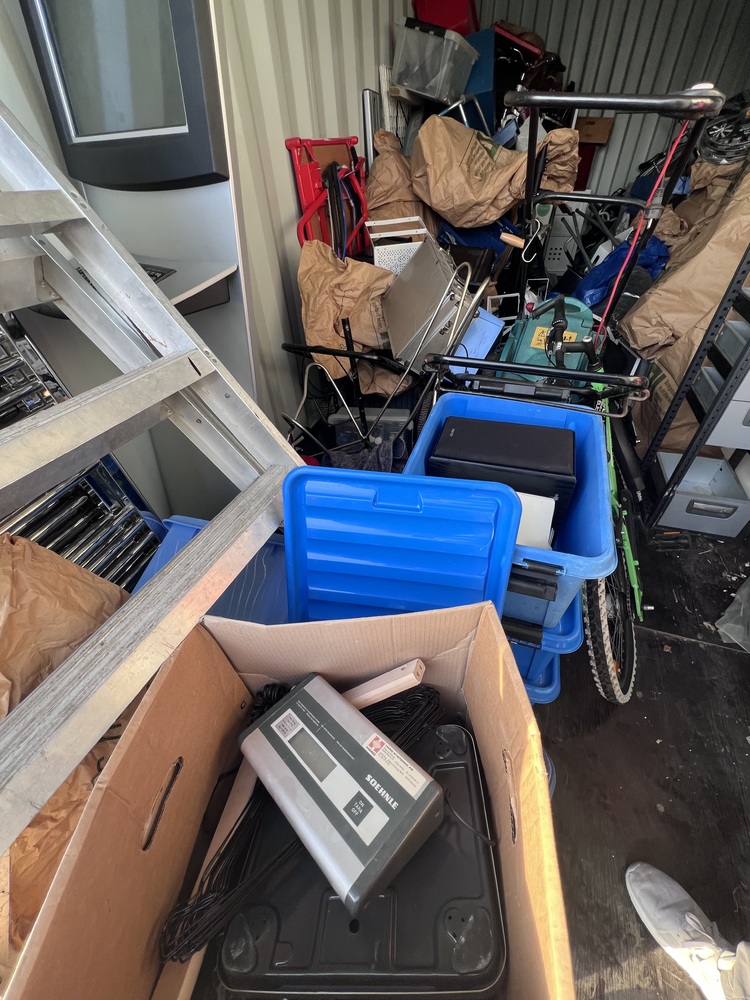 Stige, 3 cykler, trækvogn, græsslåmaskine, plastkasser, arkivskab, industrivægt, blandet elektronik, biltilbehør, haveredskaber.