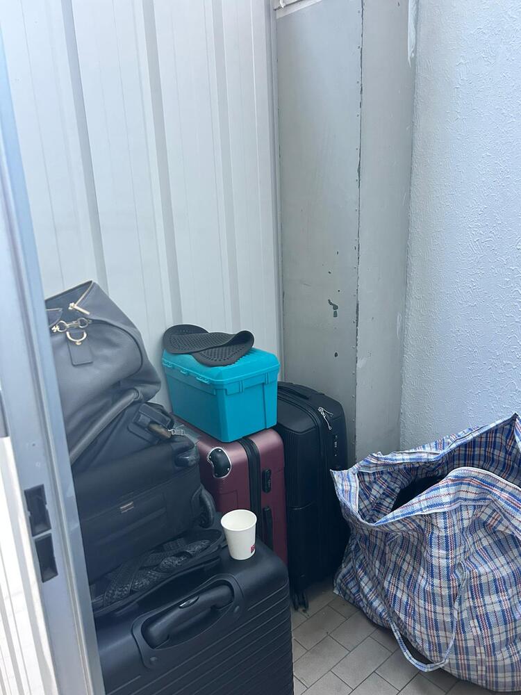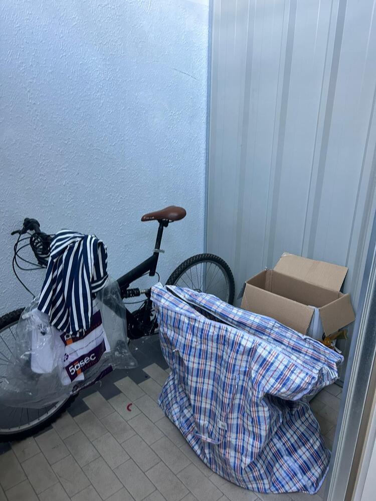 A box tem como tamanho 5m2 e visivelmente a box tem malas 2 sacos grandes com roupa e calçado e uma bicicleta.