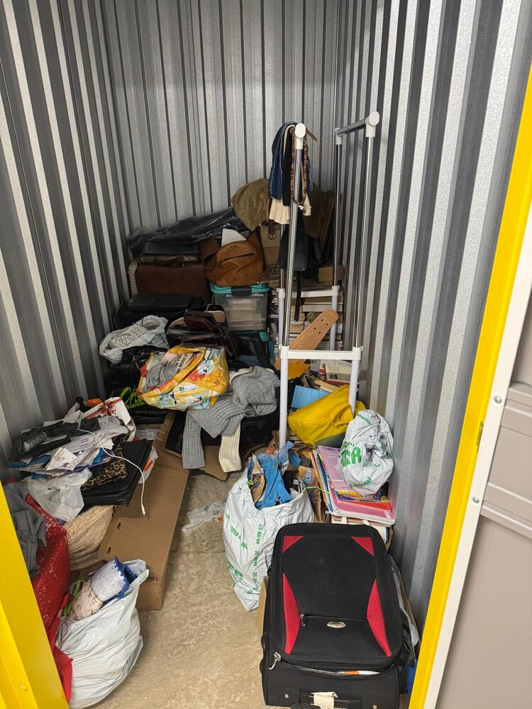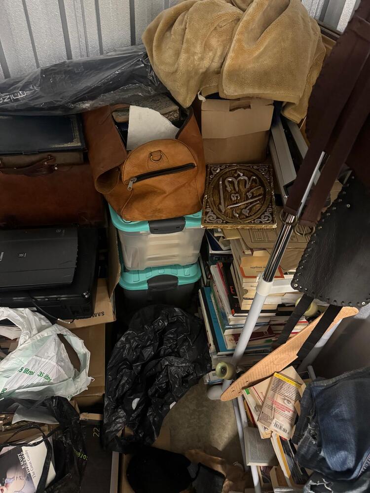 The storage unit contains a range of personal items, including books, clothing, luggage, documents, racks, cables, and miscellaneous accessories.