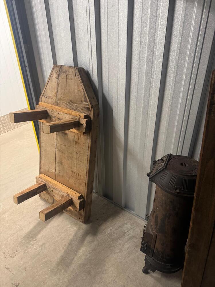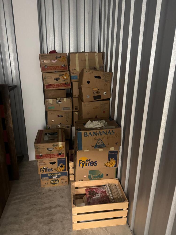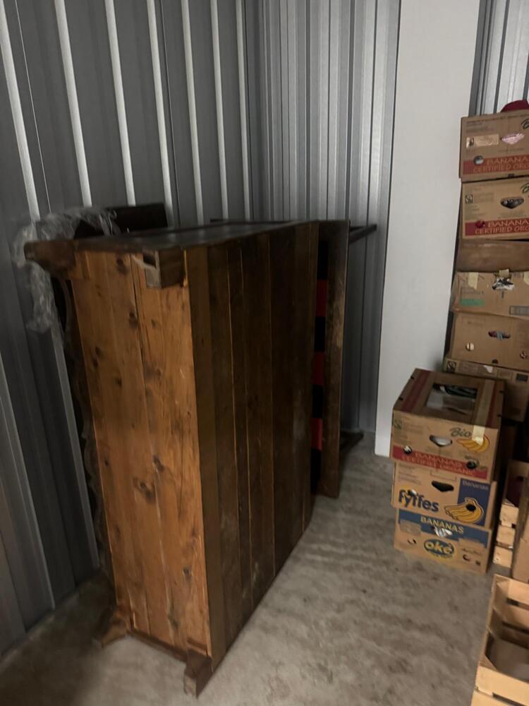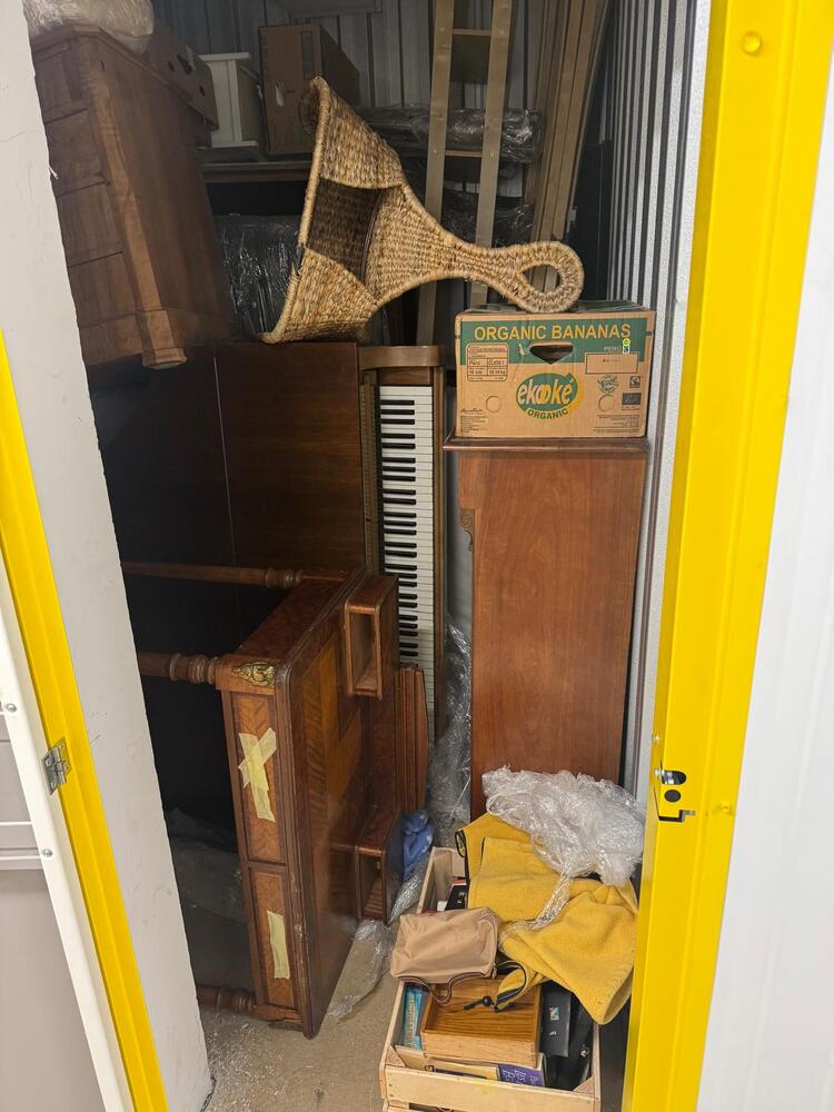 The storage unit contains various household items, including furniture, musical instruments, tables, cabinets, boxes, and miscellaneous objects.