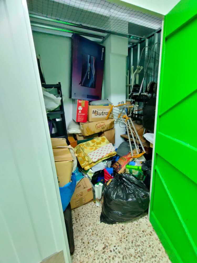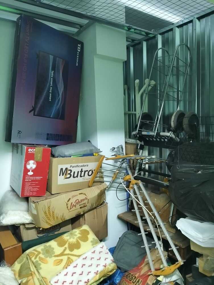 Estantería, cajas con enseres, antena, carros, escalera, tv.