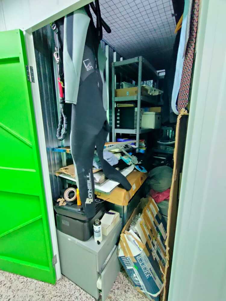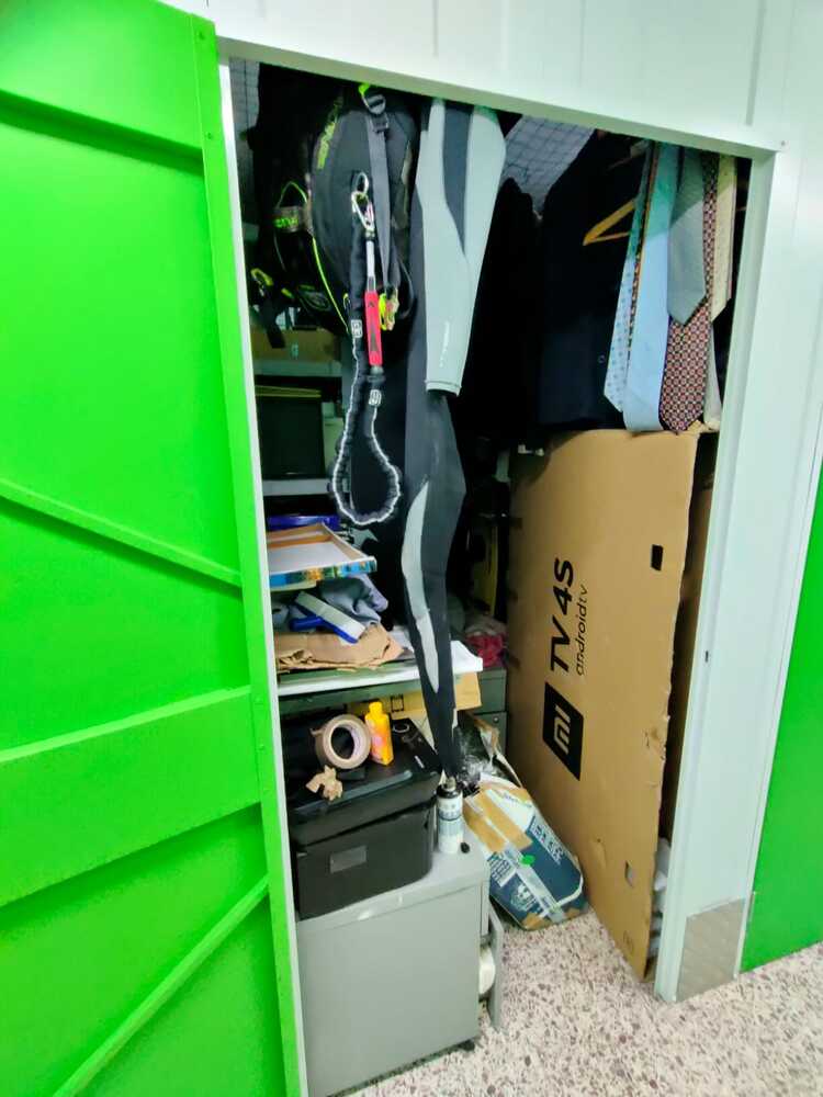 Estantería, bicicleta, neopreno, cajas con enseres, fotocopiadora, cajonera, tv,