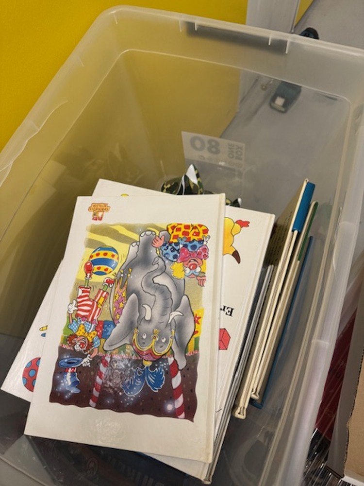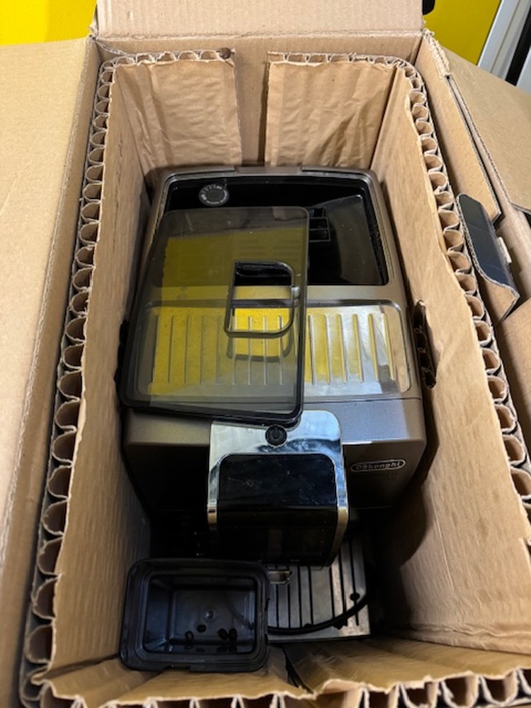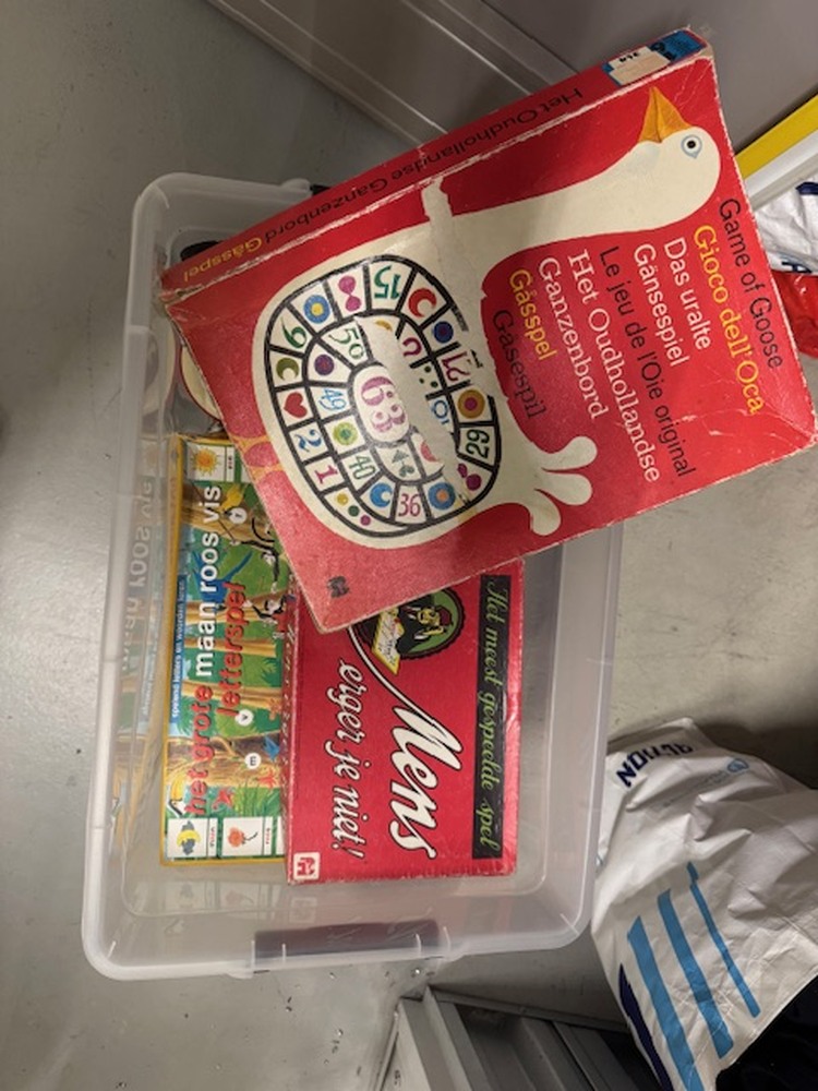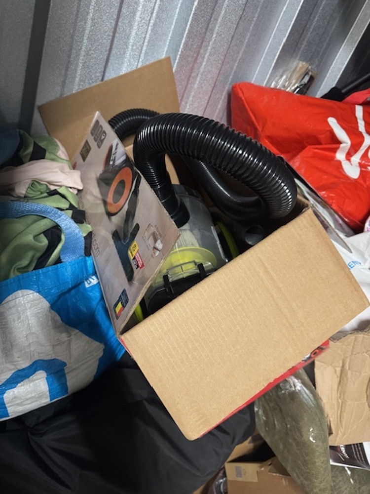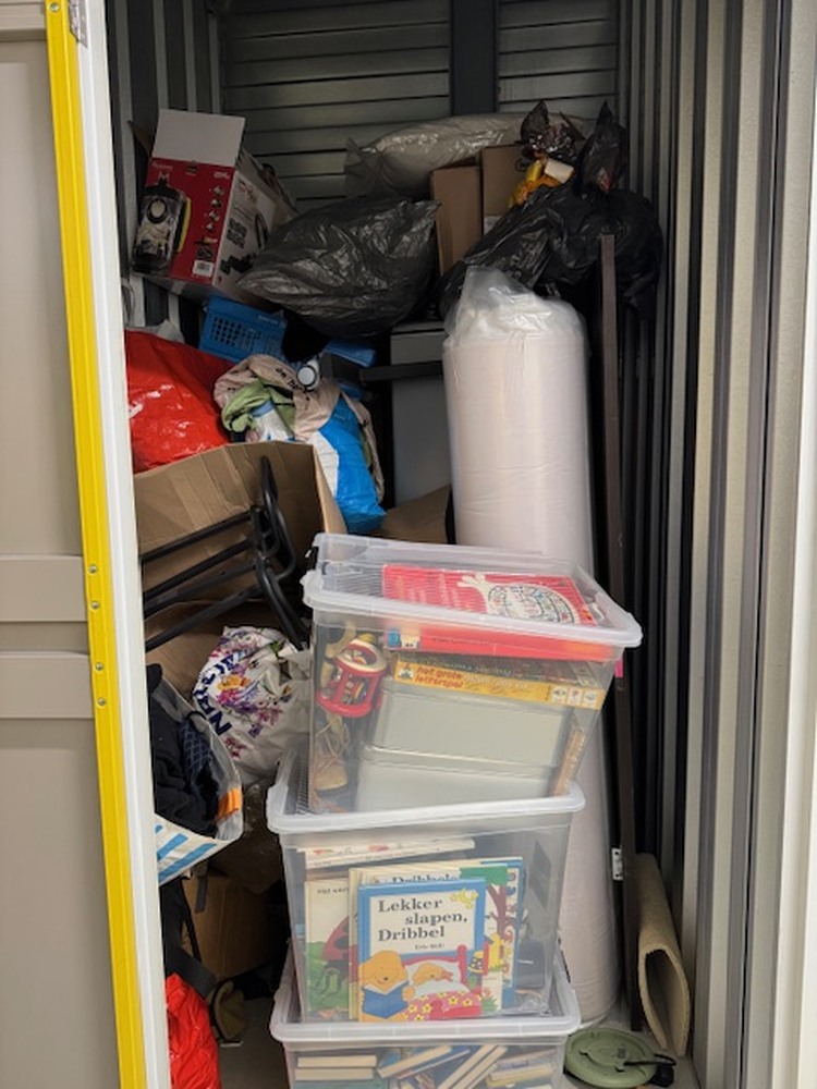 Boeken, stofzuiger, tassen met kleding, koelkast, kussen, tapijttegels, pannen/glaswerk, bureau, bordspelletjes en een DeLonghi koffieapparaat.