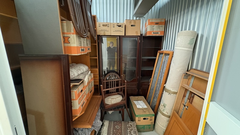• gestapelte Kartons • Verschiedene Möbelstücke • Schrank- und Regalelemente • Einzelne stehende Stühle • Lose aneinandergestellte Holz- und Möbelteile • aufgerollter Teppich • Gerahmte Flächen wie Bilder oder Glaselemente • Unterschiedliche Einrichtungsgegenstände