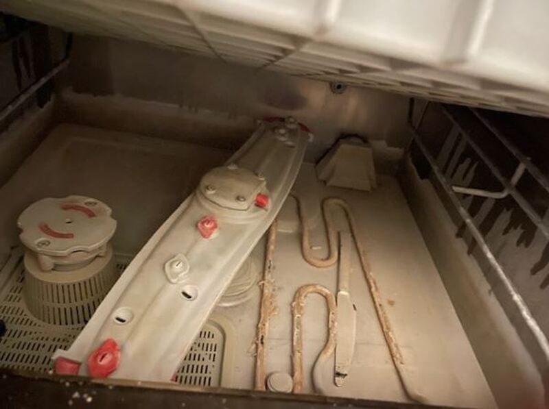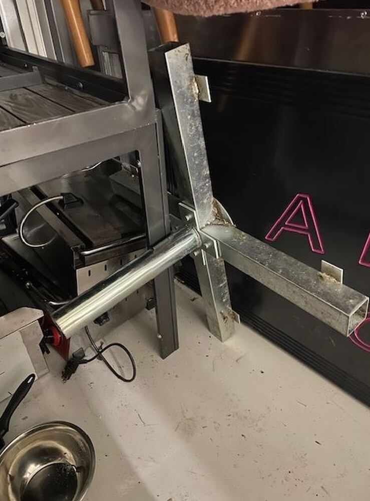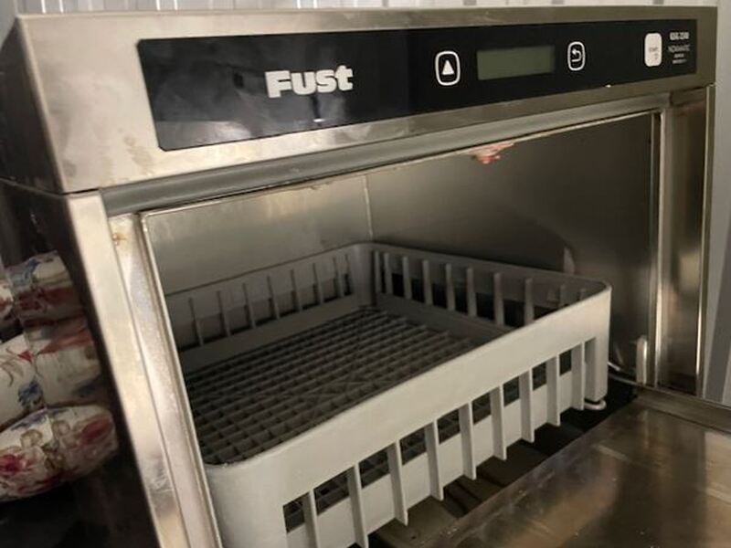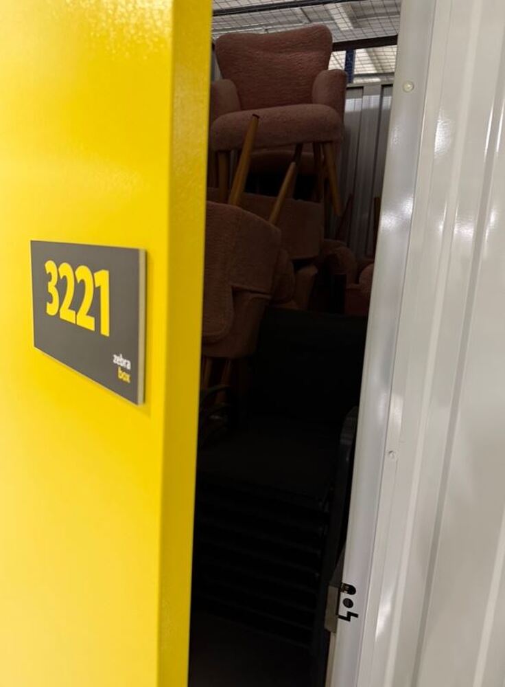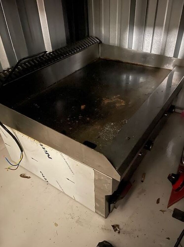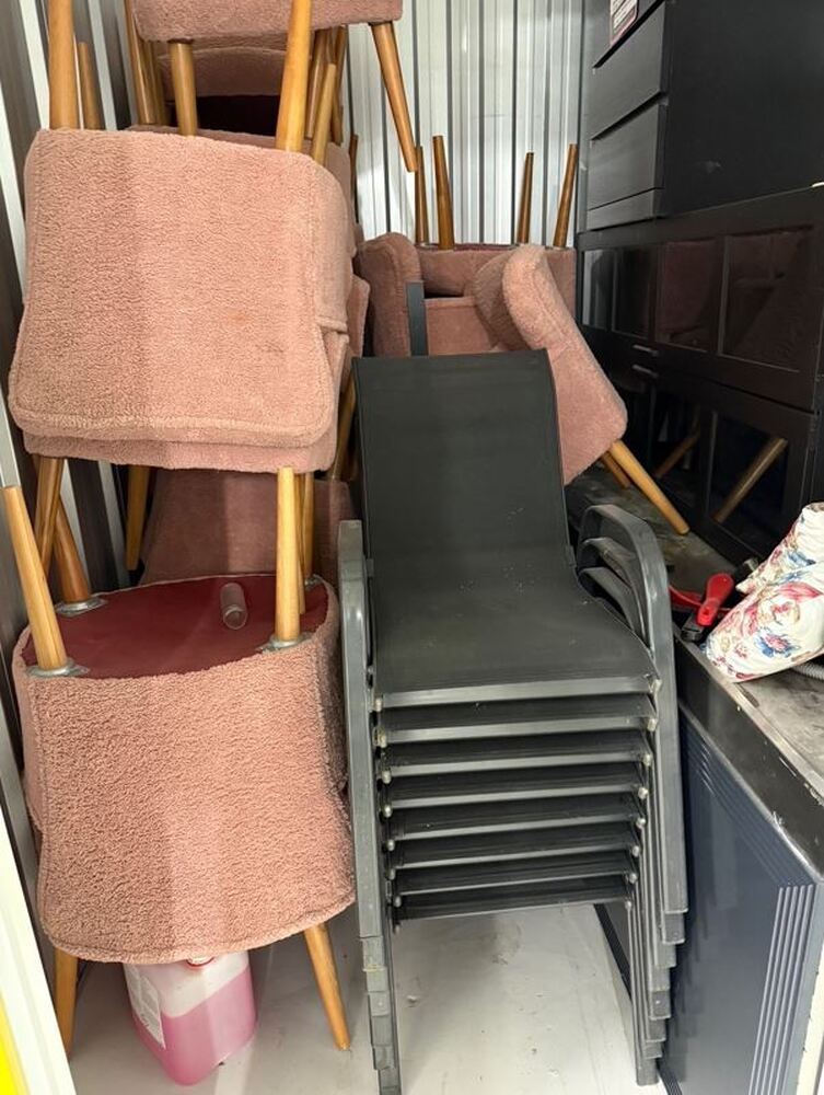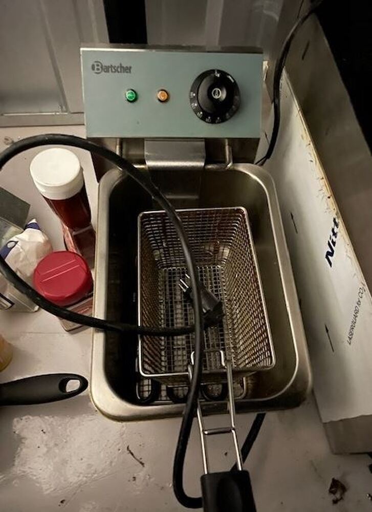 Die Box enthält diverses Gastronomie-Inventar, darunter Stühle, Grill, Fritteuse, Regale sowie einen Kühlschrank; der Verkauf erfolgt im Ist-Zustand.