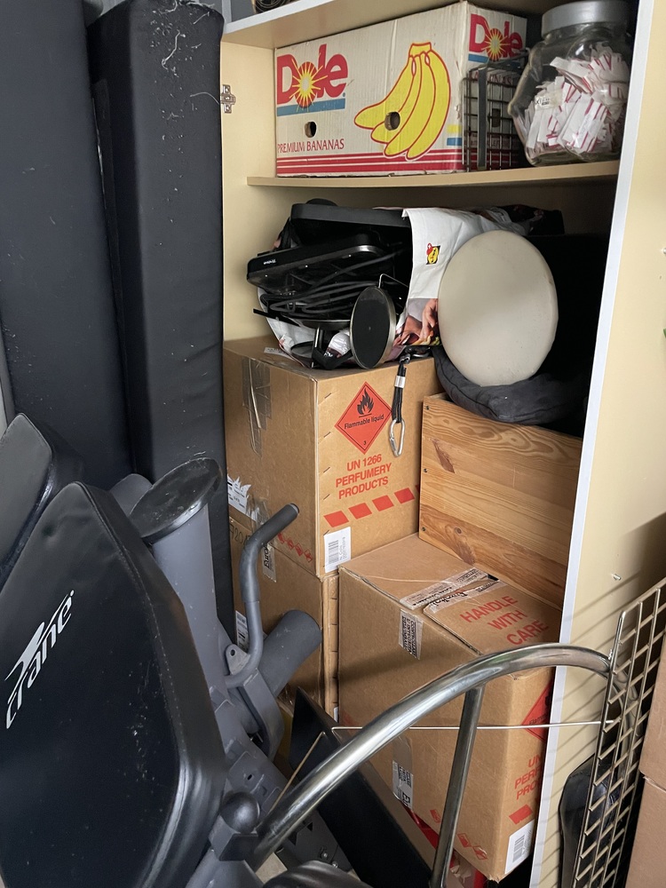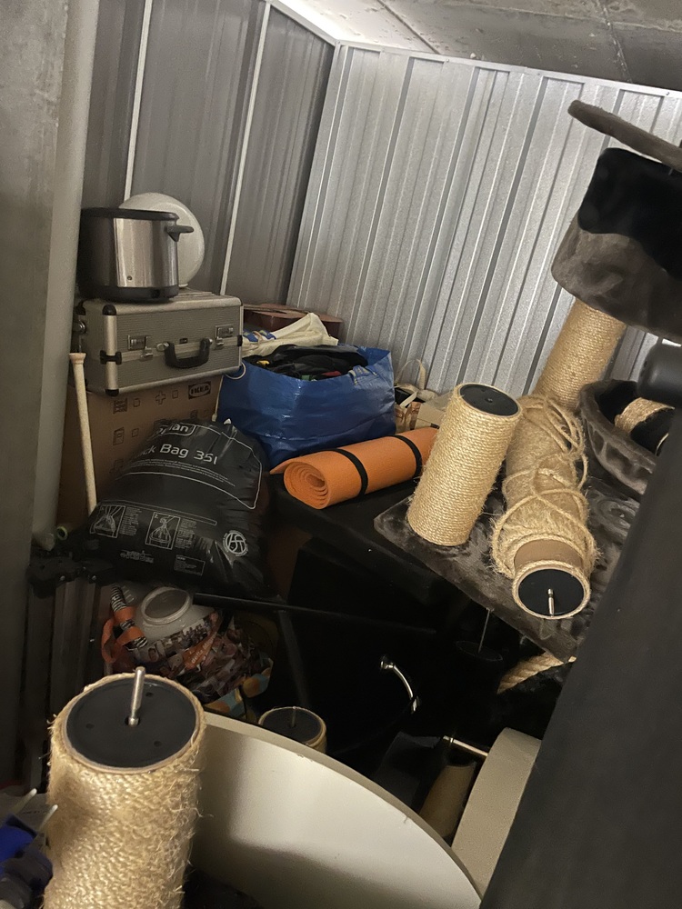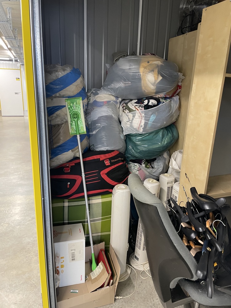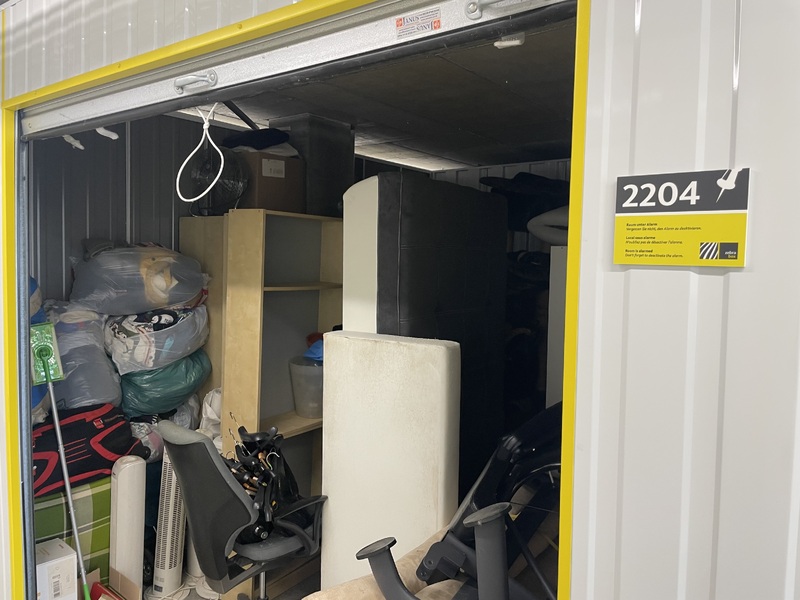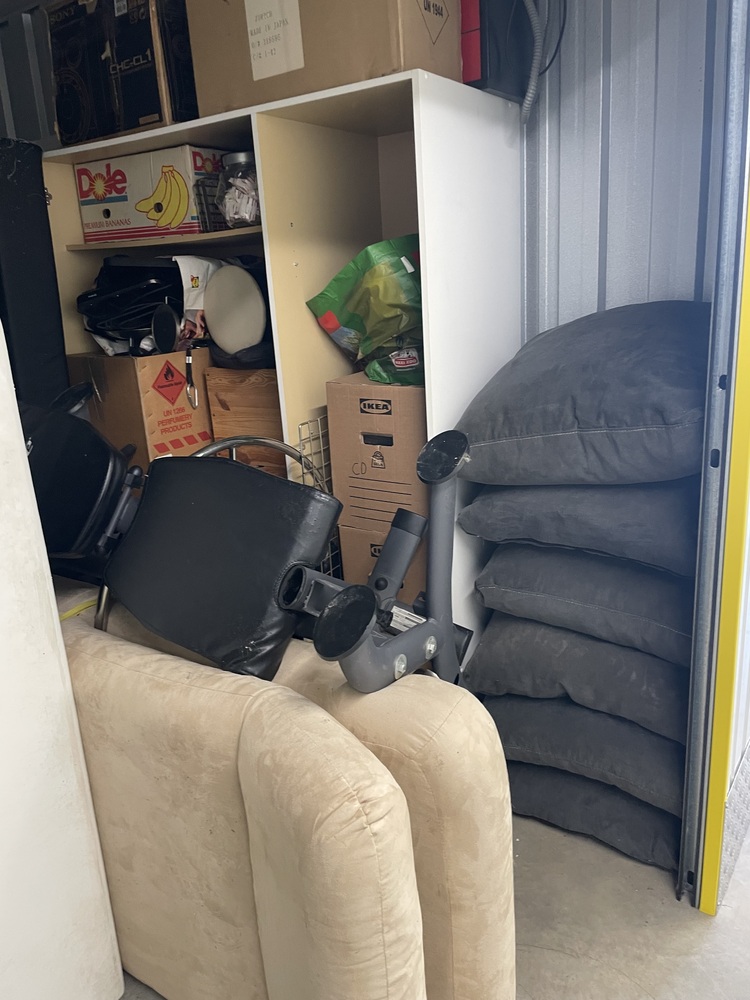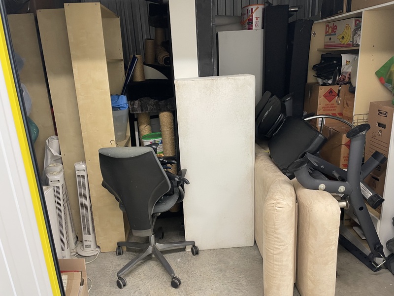 Die Box enthält diverses Wohninventar, darunter Möbelstücke, Stühle, Regale, Polstermöbel, Haushaltsgegenstände sowie Kartonagen mit gemischtem Inhalt; der Verkauf erfolgt im Ist-Zustand gemäss Abbildungen.