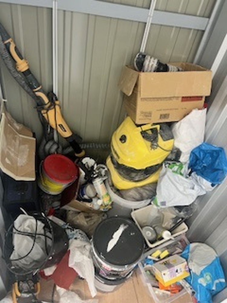 Schoonmaak machine (karcher), verfpotten, handzaag machine, emmer met spullen, doos met spullen. Zie foto\'s voor meer informatie