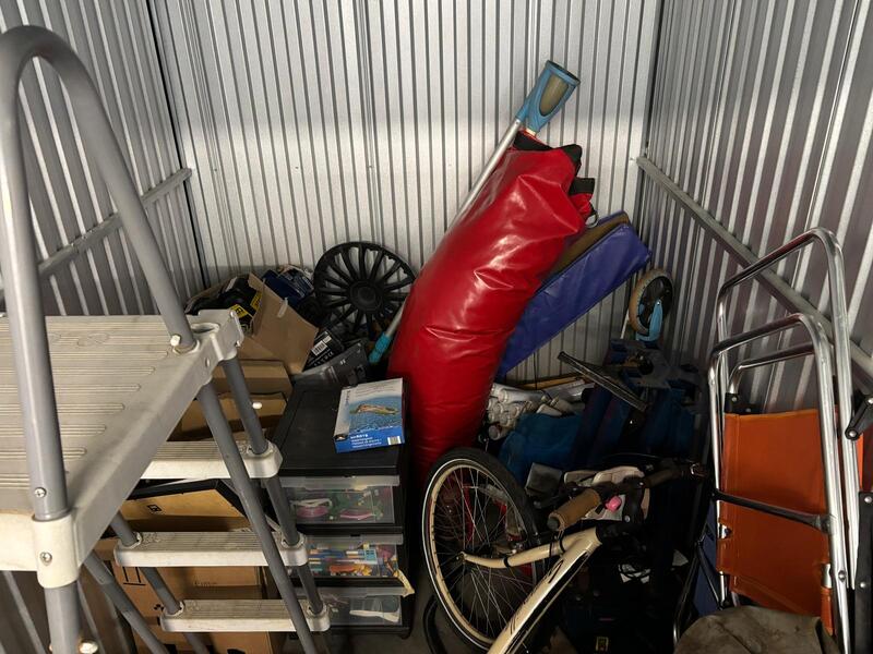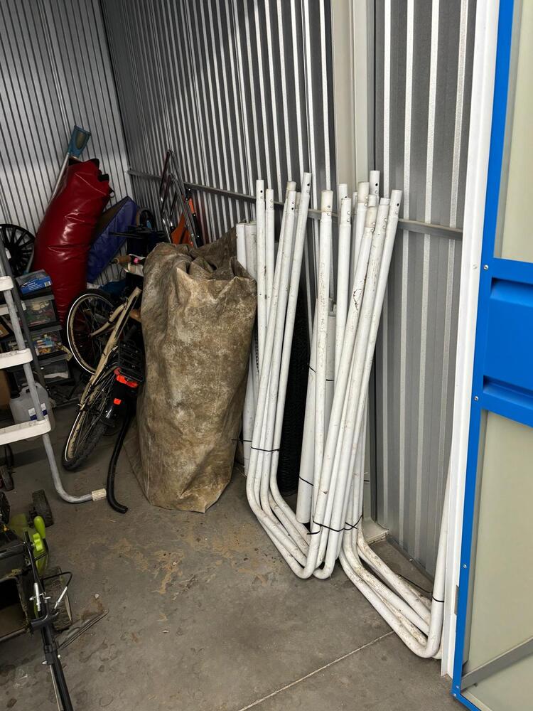 Grasmaaier - palen zwembad - zwembadtrapje - fiets - compressor - ladebakje - zwembad - velgen - ligstoel - kinderfiets