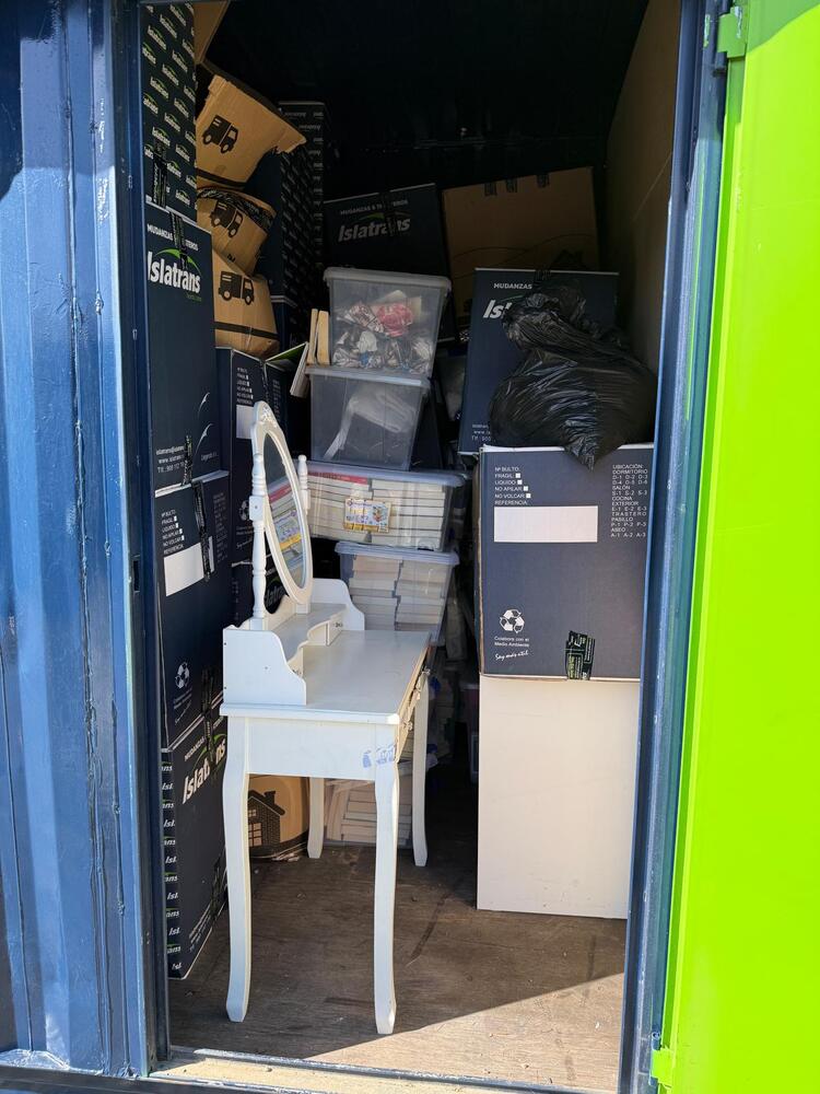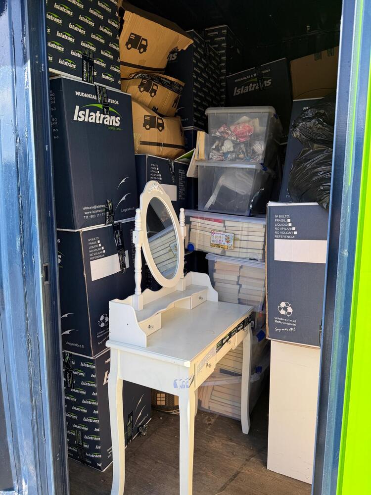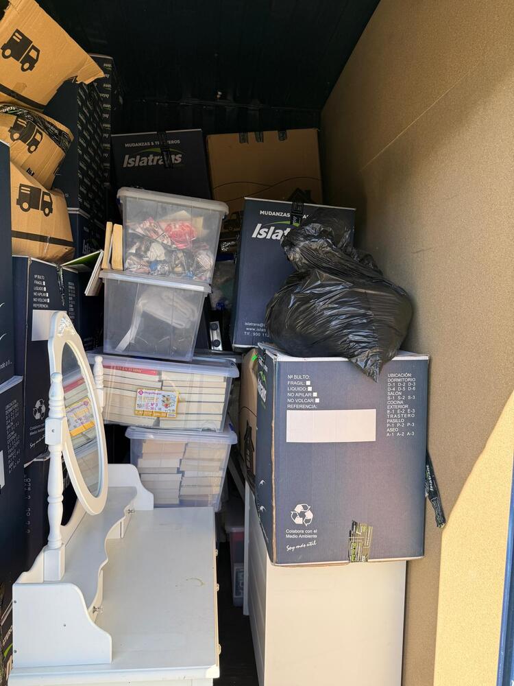 Comoda, escritorio y cajas con enseres.