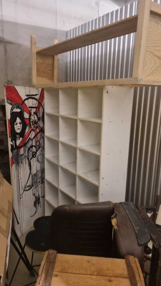 Weißes Regal Holzkisten und Holzbretter Tische Stühle Kartons Bild/Leinwand