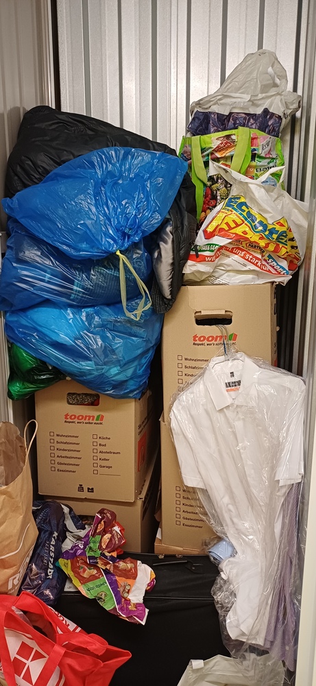 Bei der Sichtung der Box wurden folgende Gegenstände aufgenommen: - diverse Tüten mit Kleidung - 5 Kartons - Koffer