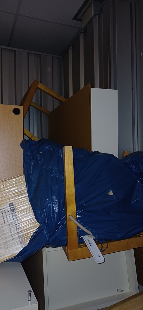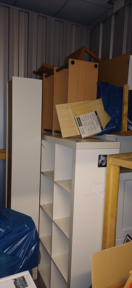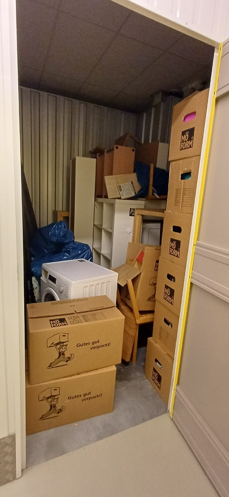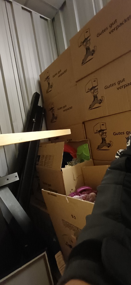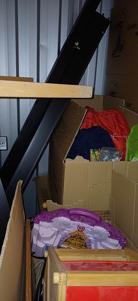 Bei der Sichtung der Box wurden folgende Gegenstände ermittelt: - circa 20 Kartons - diverse blaue Säcke - ein Hochbett - eine Waschmaschine - mehrere Regale - 4 Stühle und ein dazugehöriger Tisch