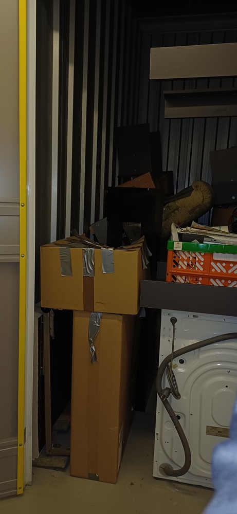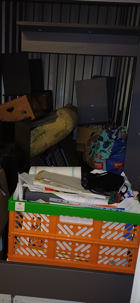 Hey der Sichtung der Box wurden folgende Gegenstände festgestellt: - Tisch mit Sitzbank - eine Waschmaschine - ein Sofa mit Schlaffunktion - mindestens 5 Kartons - verschiedene Tüten und Körbe