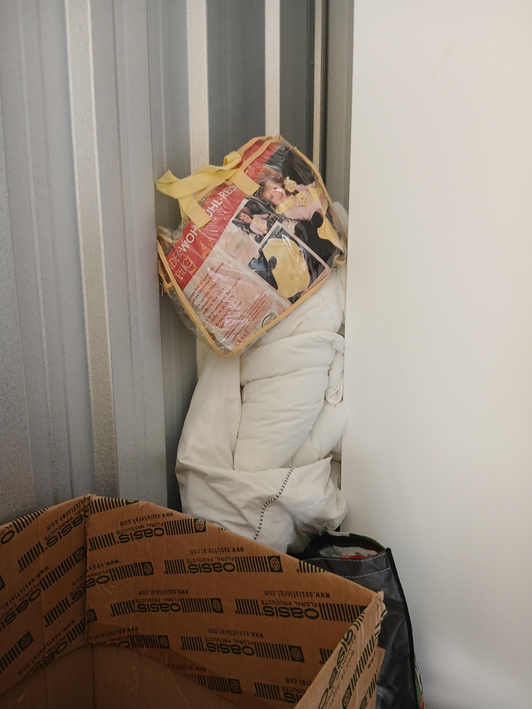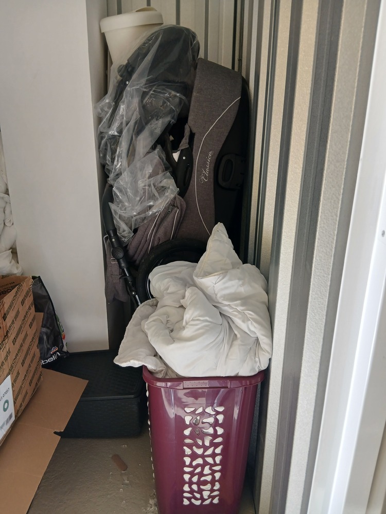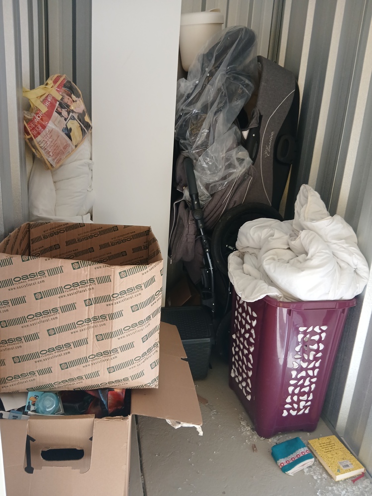 Bei der Sichtung der Box wurden folgende Gegenstände aufgenommen: - ein Kinderwagen - 2 Kartons - eine Kiste aus Plaste - Bettzeug (Kissen und Decke) - ein Kindernackenhörnchen - eine Kleidungsaufbewahrungsbox