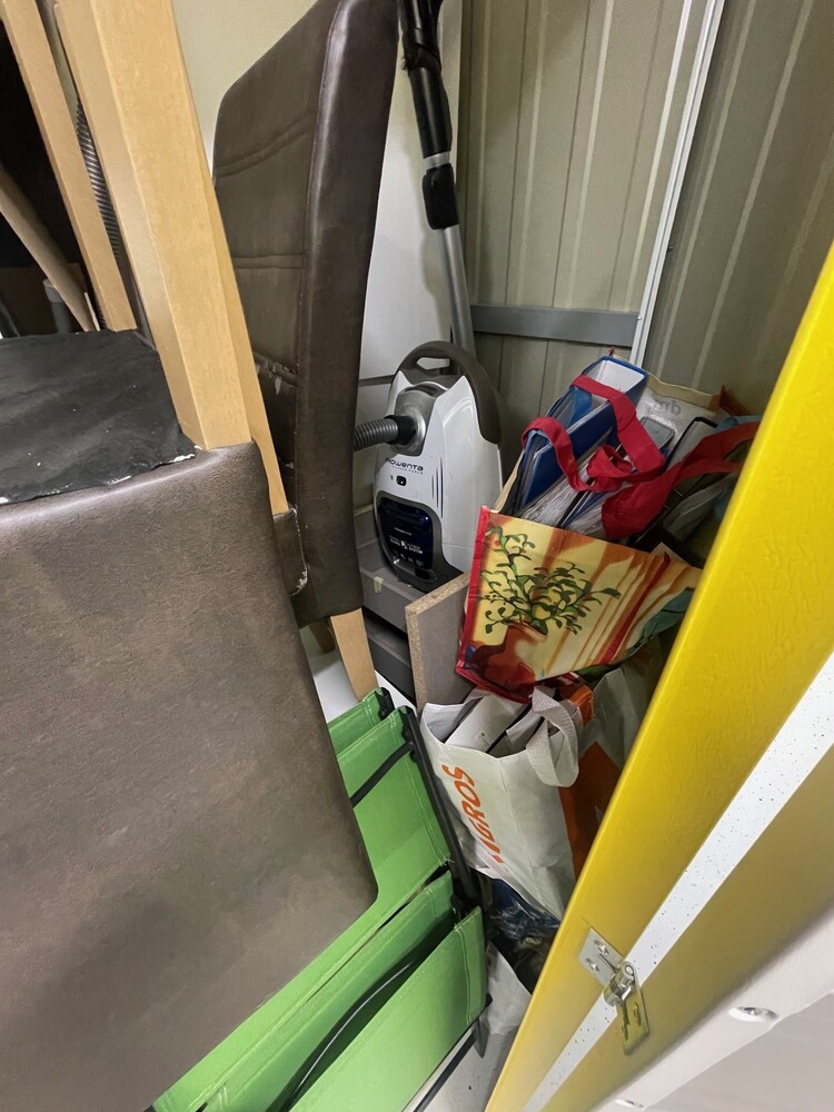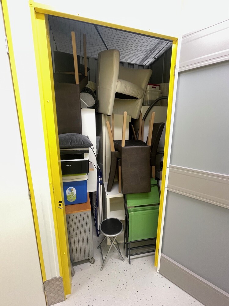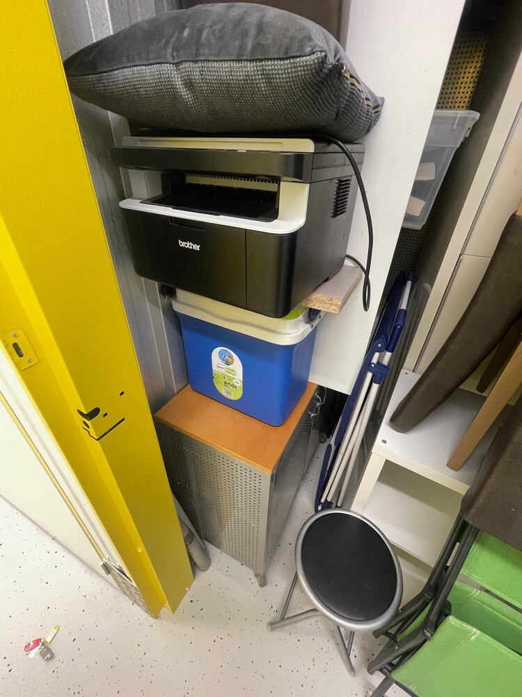 Die Box enthält diverses Mobiliar und Haushaltsinventar, darunter Stühle, Kleinmöbel, einen Drucker sowie verschiedene Gebrauchsgegenstände; der Verkauf erfolgt im Ist-Zustand gemäss Abbildungen.