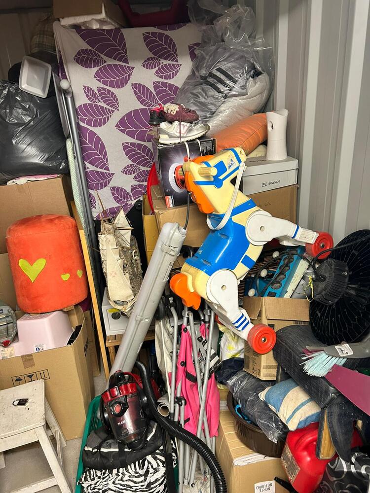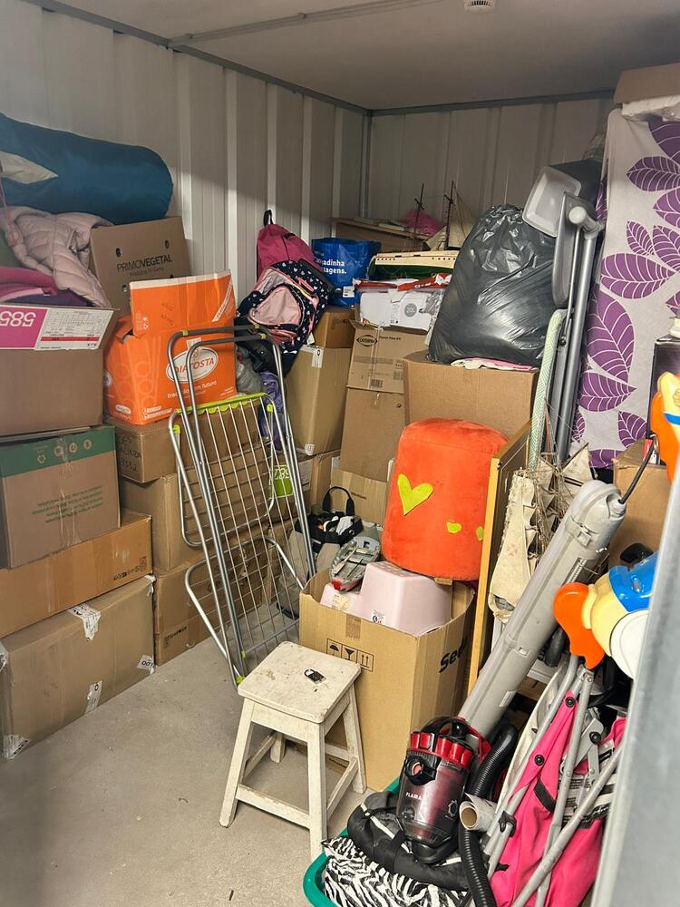 A box tem como tamanho 5m² e visivelmente tem um aspirador de pó, brinquedo infantil , sacos e muitas caixas.