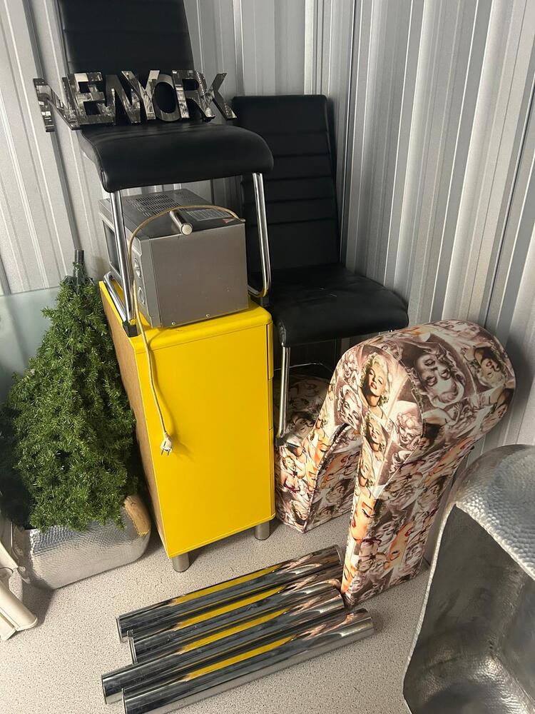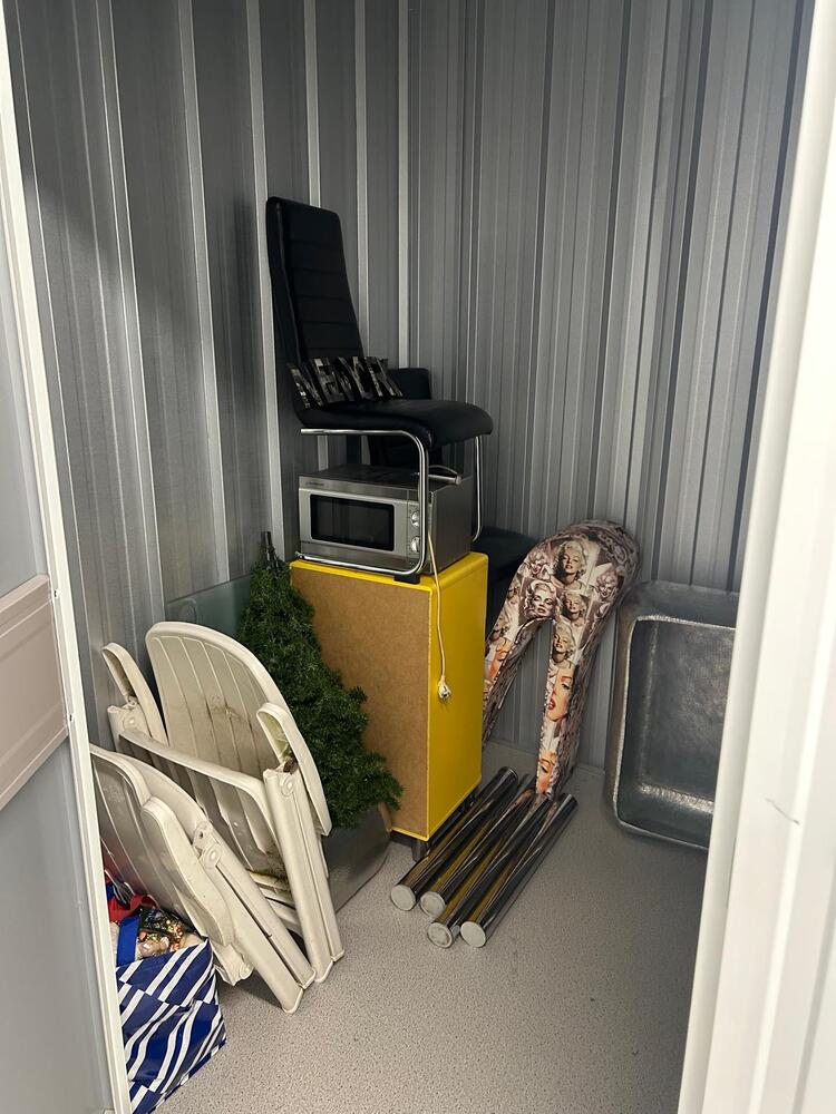 • 2 eetkamerstoelen • 1 koel-vriescombinatie LG • 2 metalen plantenbakken • 1 kunststof kerstboom • 1 reiskoffer • 1 stoffen stoel • 1 geel kastje met lades • 1 glazen tafel met chroom tafelpoten • 1 magnetron • 2 plastic tuinstoelen • 1 tas met kleine huisraad