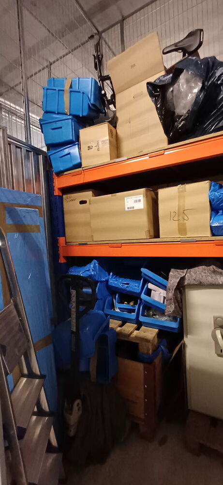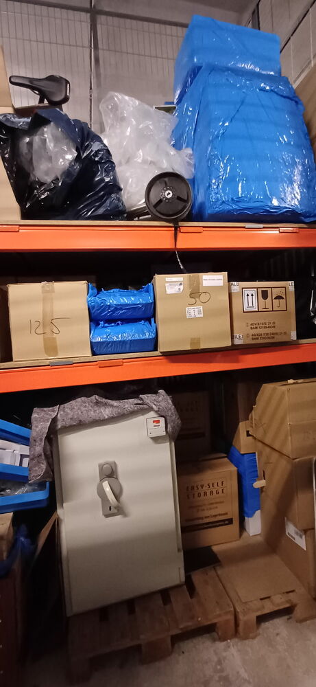 Tresor, Fahrrad,mehrere Kartons ( vermutlich mit Inhalt),blaue Kisten ( vermutlich mit Inhalt,diverses