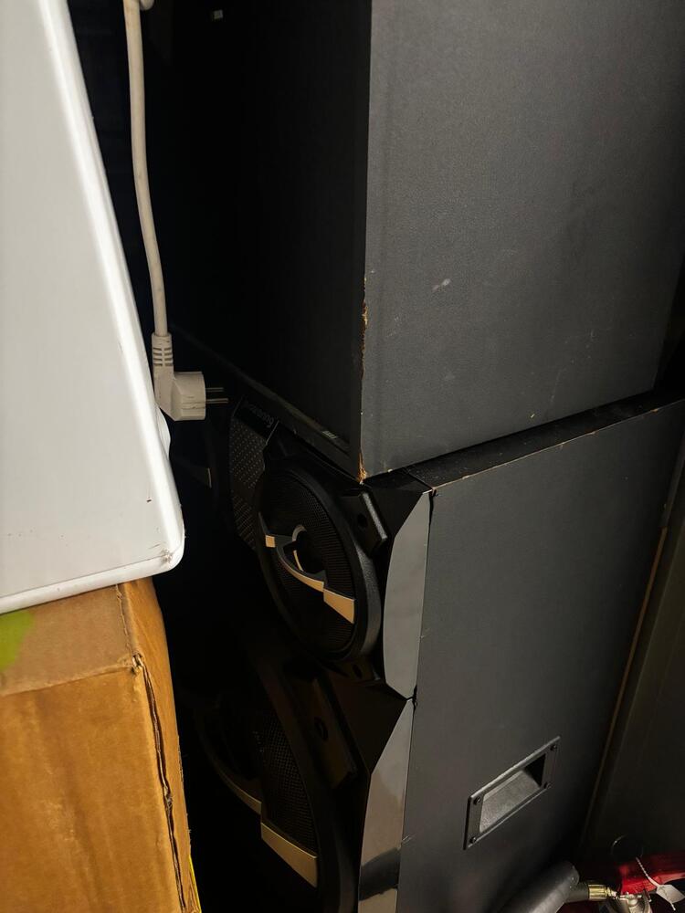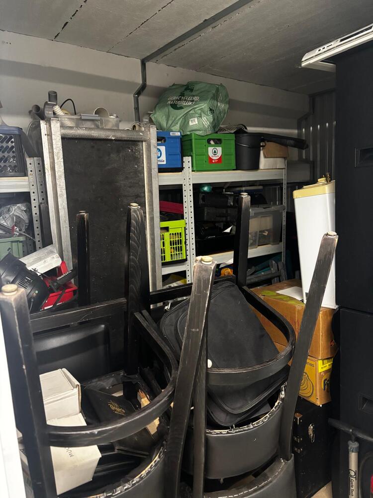 Stoelen, stereo installatie met grote speaker set, werkmateriaal, rekken, metalen kast met inhoud, huishoudelijk materiaal, kleine boiler, verlichting, pluggen vijzen en boren,...