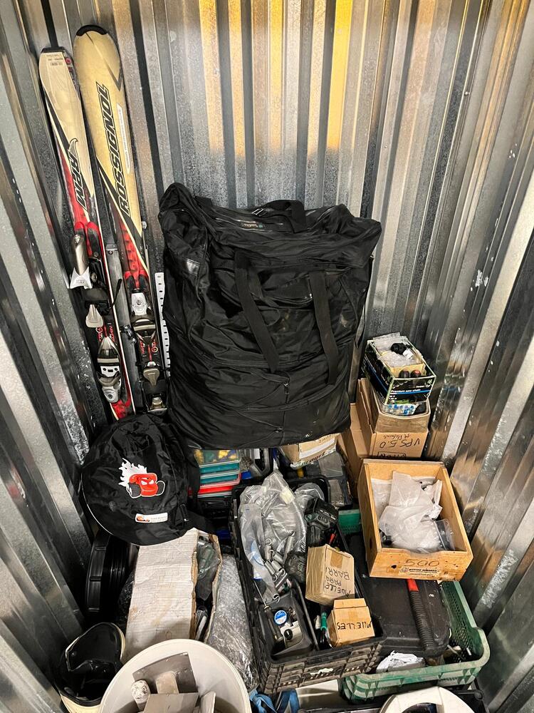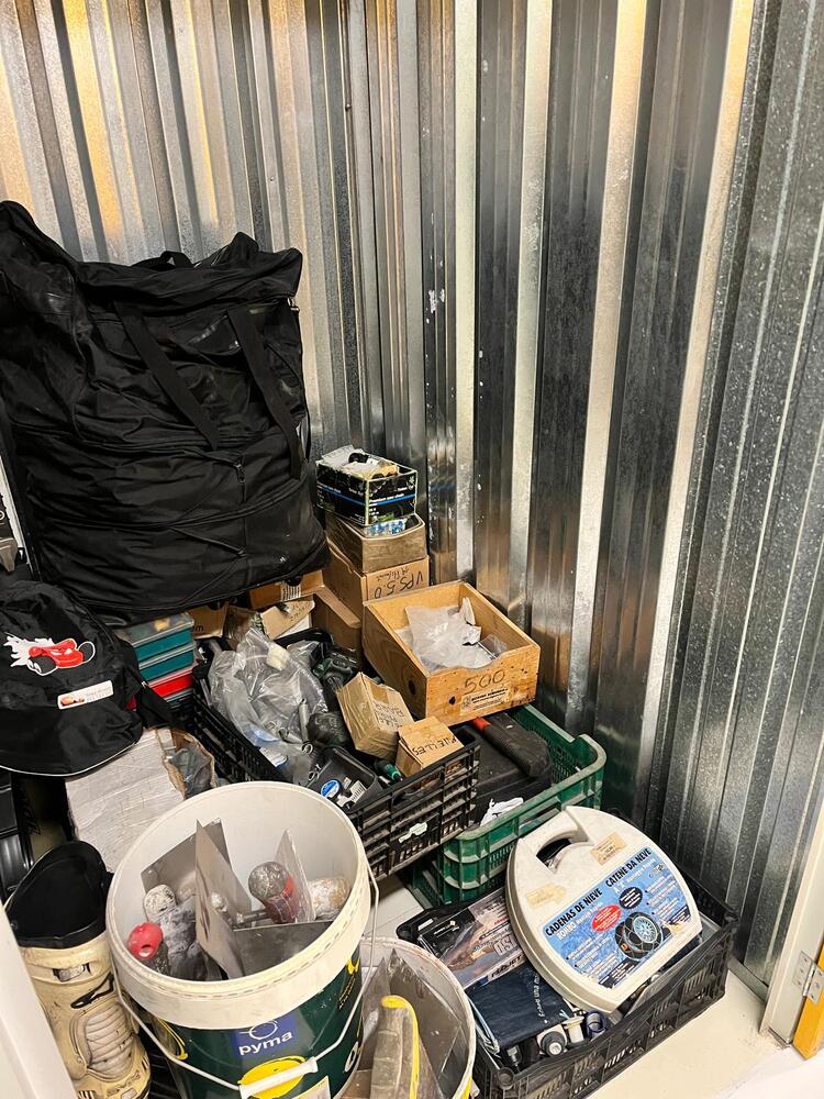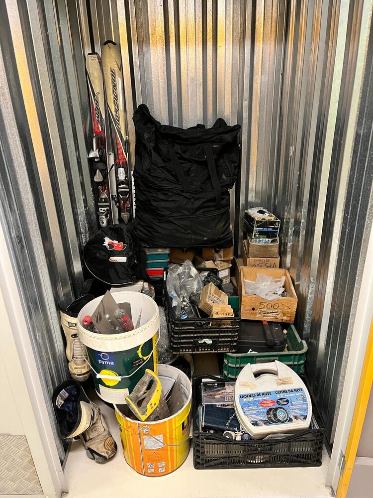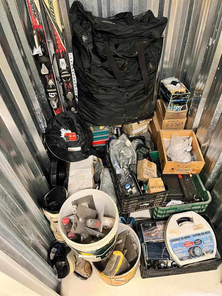 Esquís con botas, casco de moto, herramientas de mano, taladro, cadenas de nieve y mucho más.