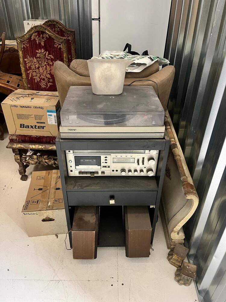 Nevera, muebles antiguos, equipo de musica con altavoces, copas, tazas etc.