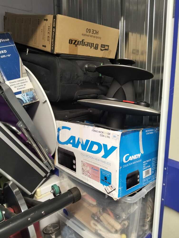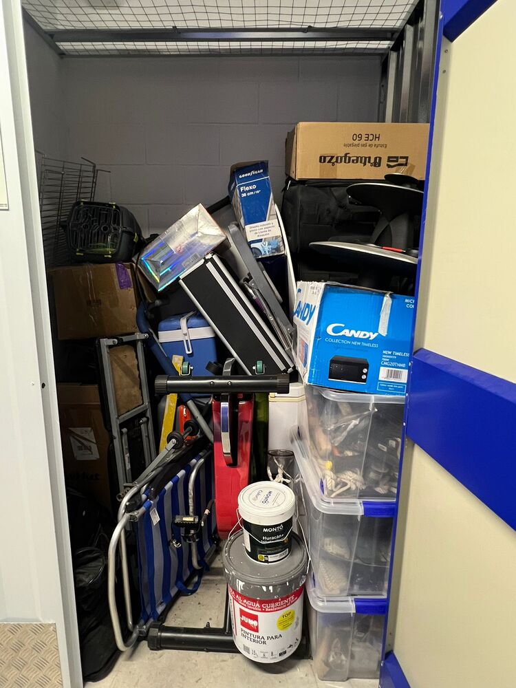 Trastero de 2m2 con muebles, electrodomésticos, cajas de herramientas, bici estática y maletas