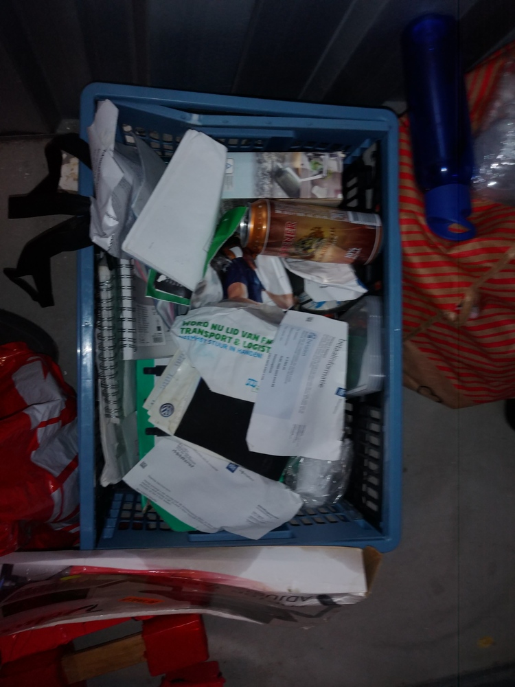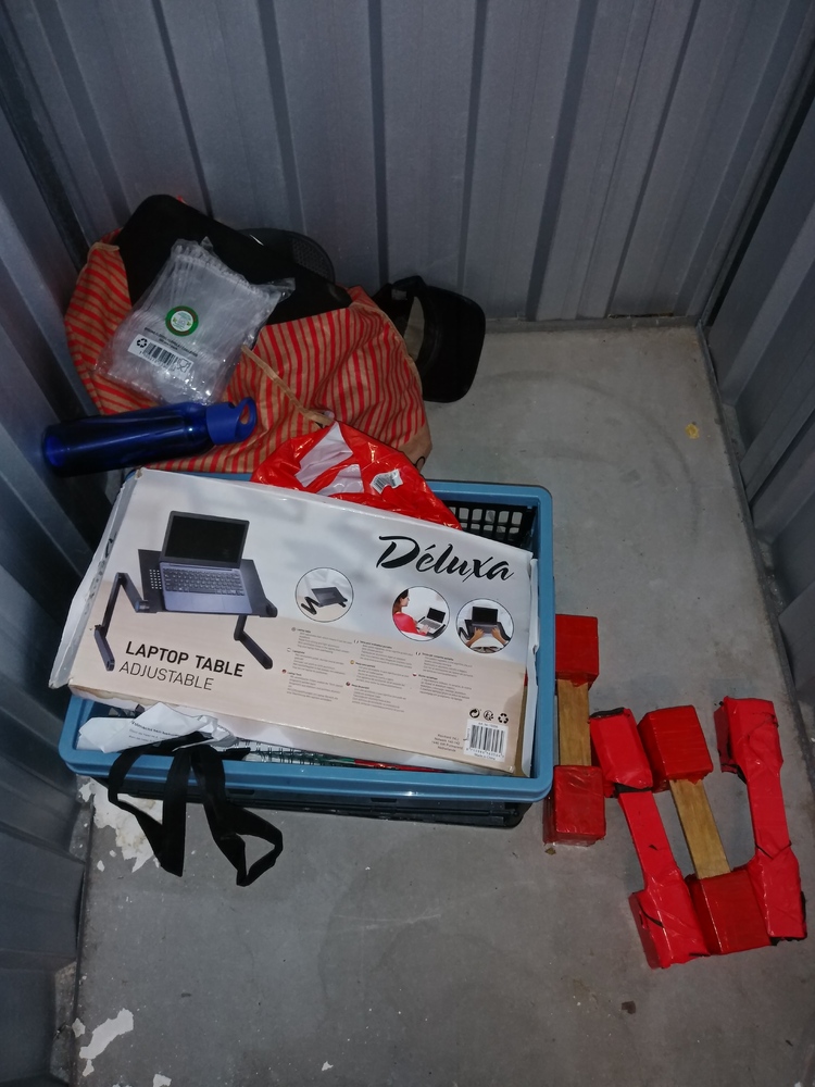 Laptop, krat met spullen en tas met spullen