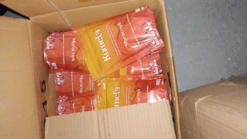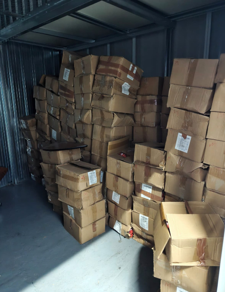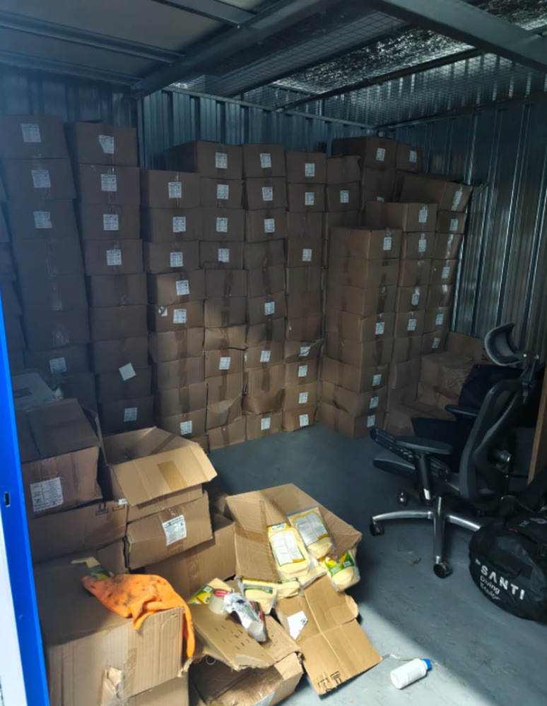 Trastero de 18m2 con cajas de harina de maíz y panela pulverizada con sabores (bebida instantánea), silla de escritorio y silla para coche de bebé