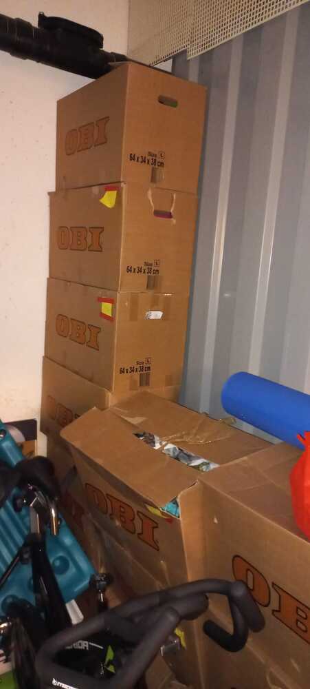 lots of boxes, outdoor gear, sports equipment