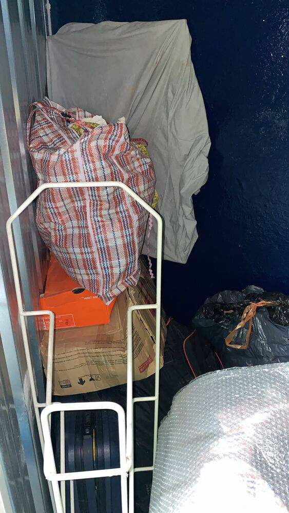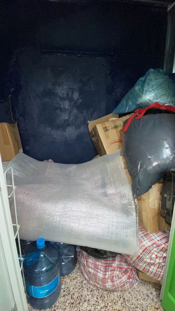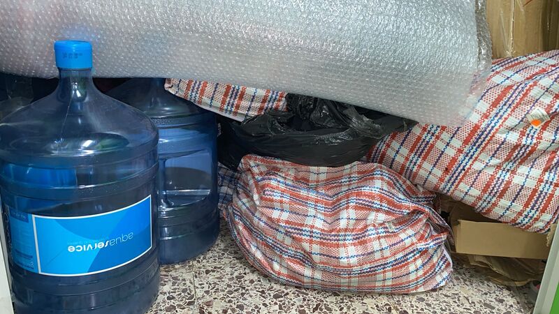 Botellas grandes de agua, cajas, bolsas, maletas