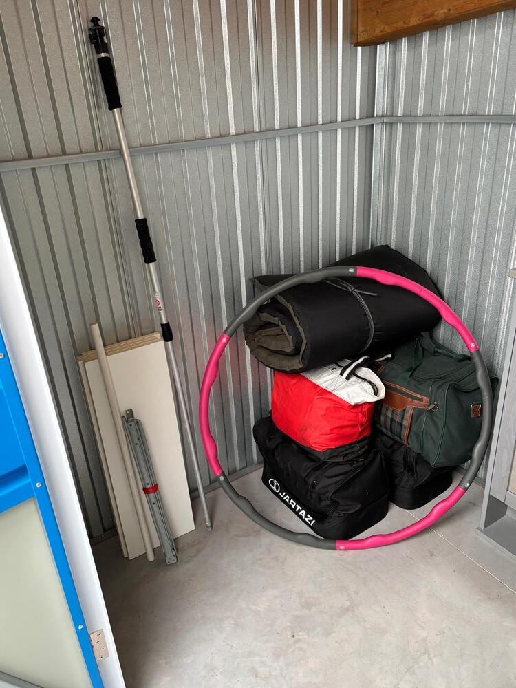 Kampeermateriaal - hoepel - houte planken - sportzakken - kast - schoenen - plastic opbergdozen
