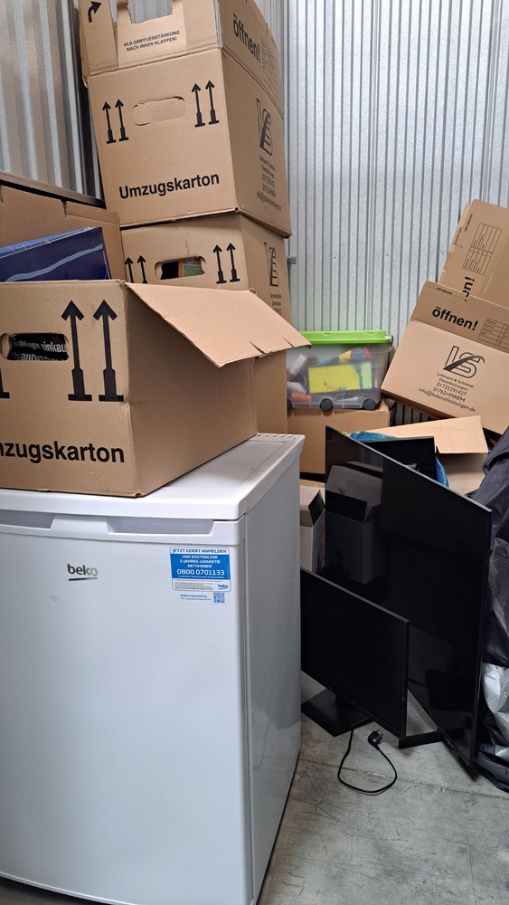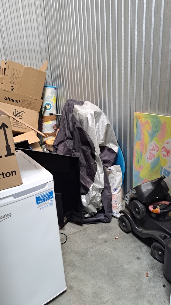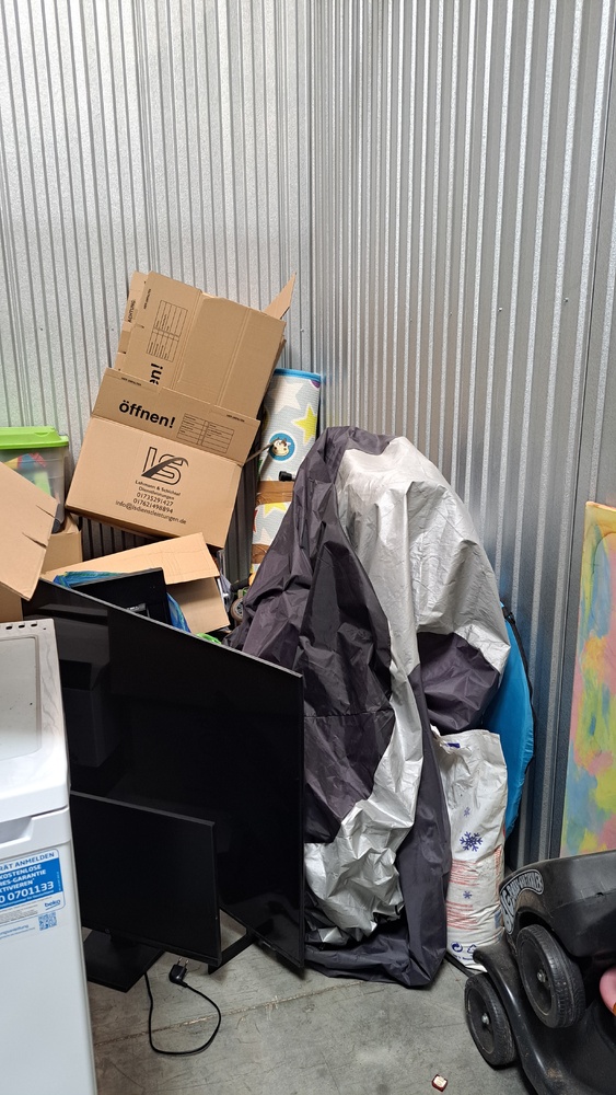 5m² Box, Fenseher, Bildschirm, Bobbycar mit Anhänger, diverse Kisten und Kartons, Weinflaschen, Schwert etc