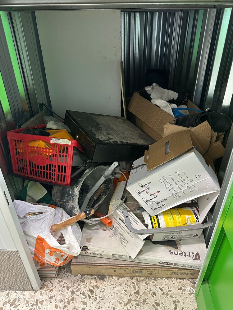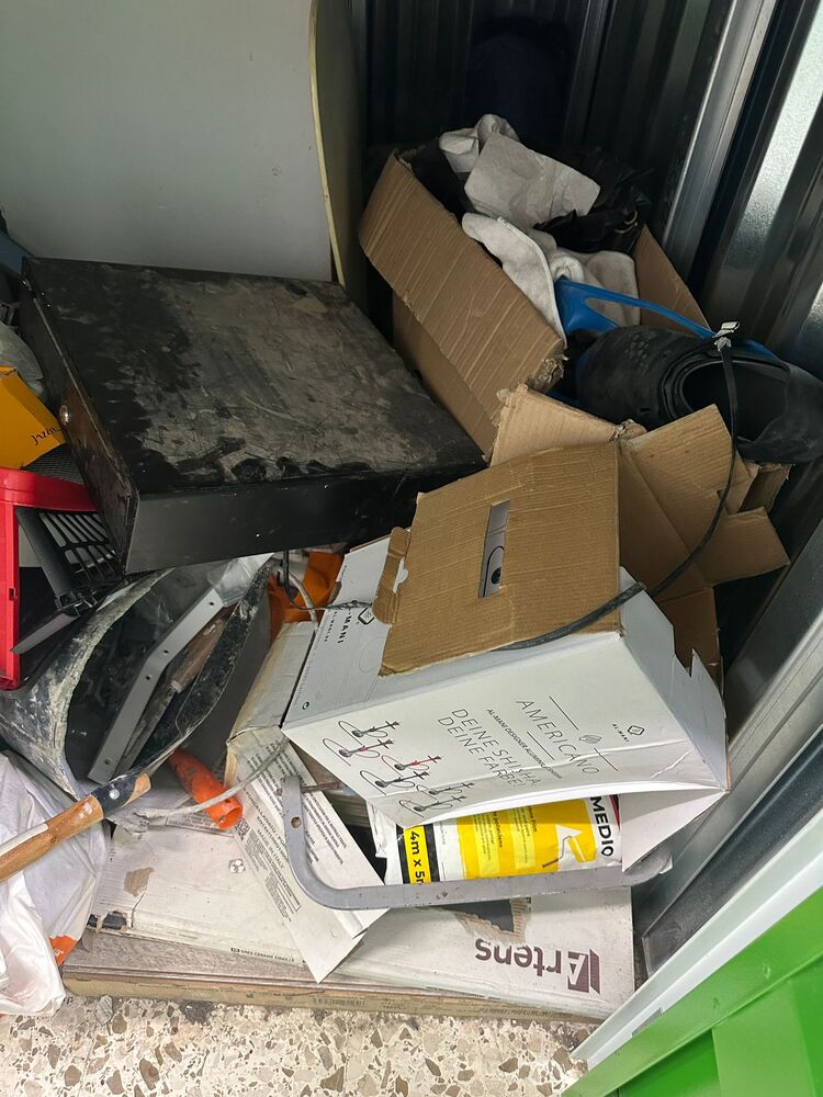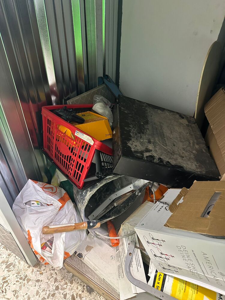 PlayStation controller, shoes, boxes, bags, construction materials, coin tray.