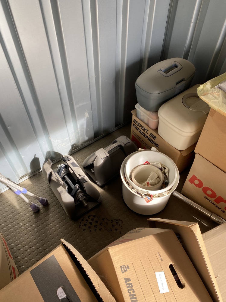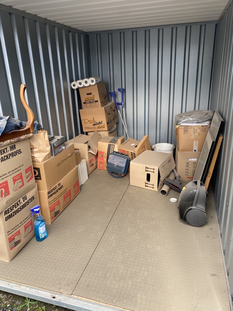 6qm Meter unit in Rosbach, with a few special items such as a guitar, weights, dvds and Cd's as well as a vacuum cleaner and work tools. The unit is located on the ground floor and you are able to load easily directly in front of the Container.