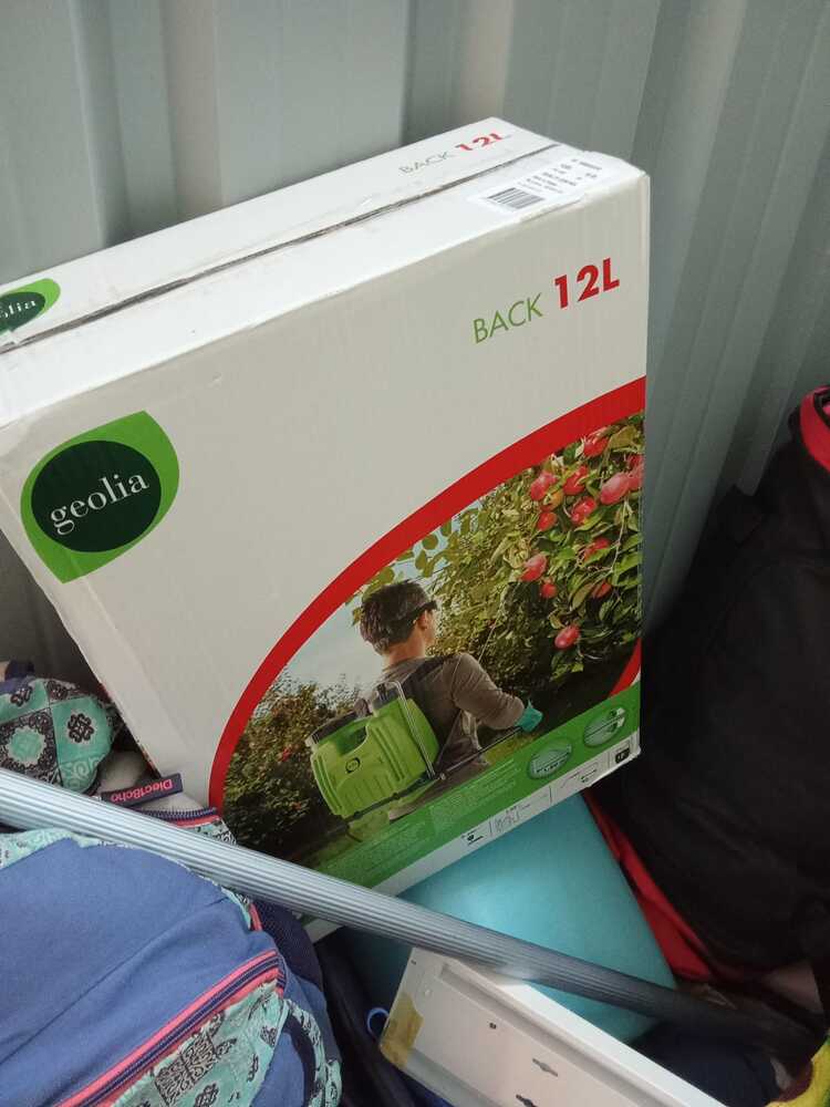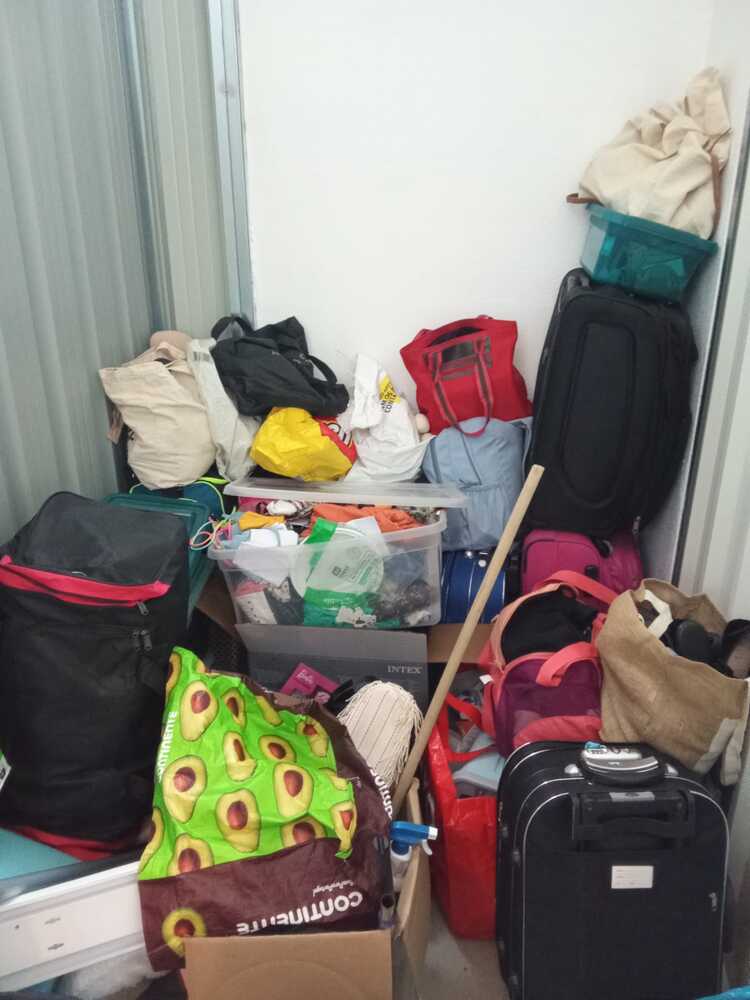Box com muitas malas , mochilas , malas de viagem e bens pessoais, roupas e sapatos. Material de limpeza, máquina pulverizadora