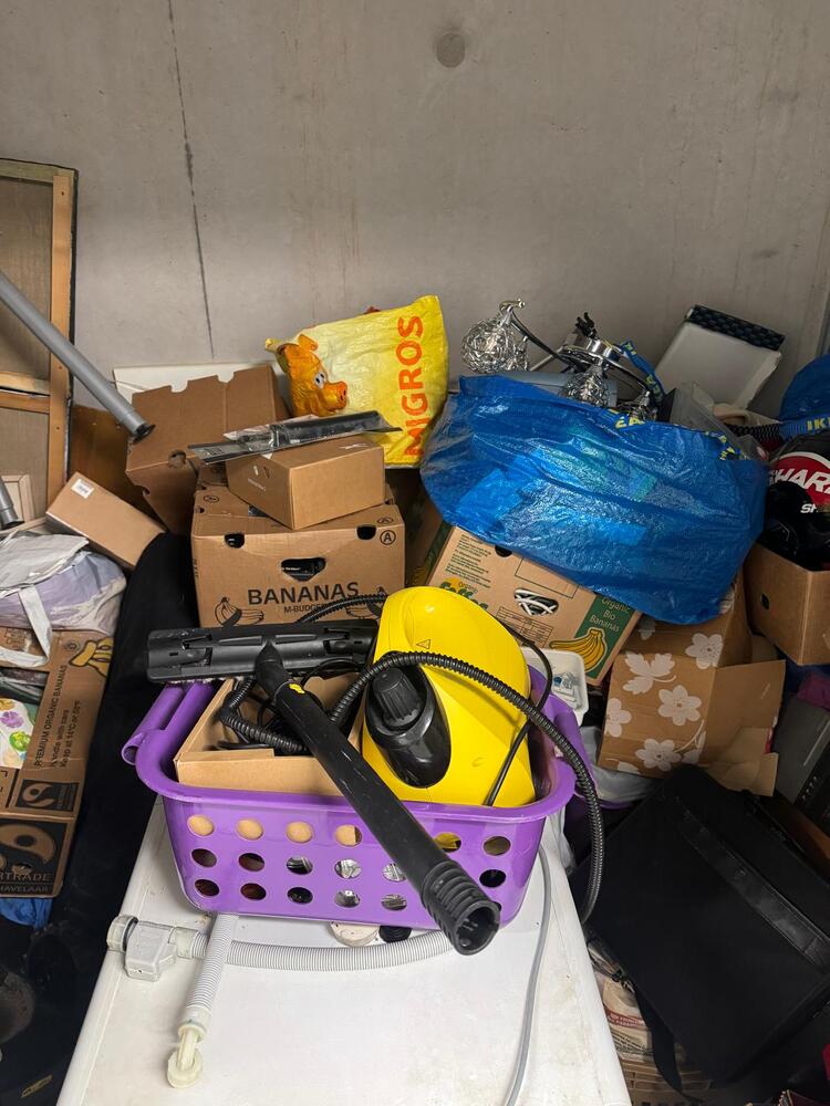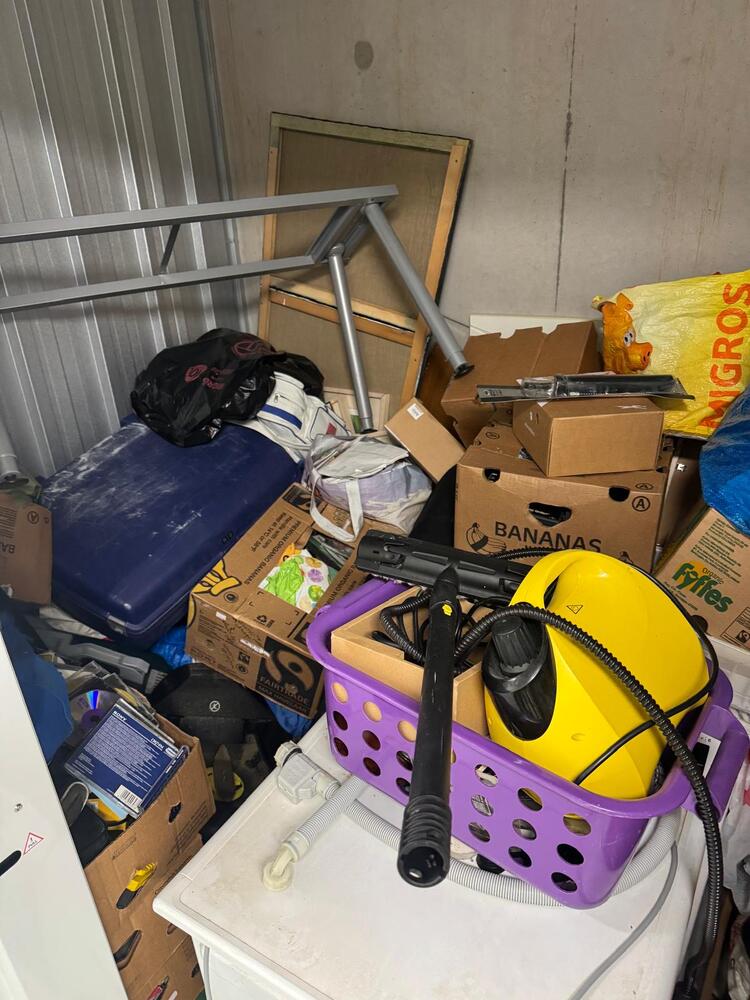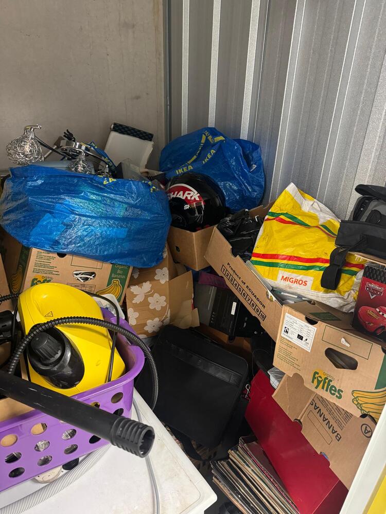 The storage unit contains a variety of household items, including appliances, furniture, clothing, books, records, lighting, and electronic equipment.